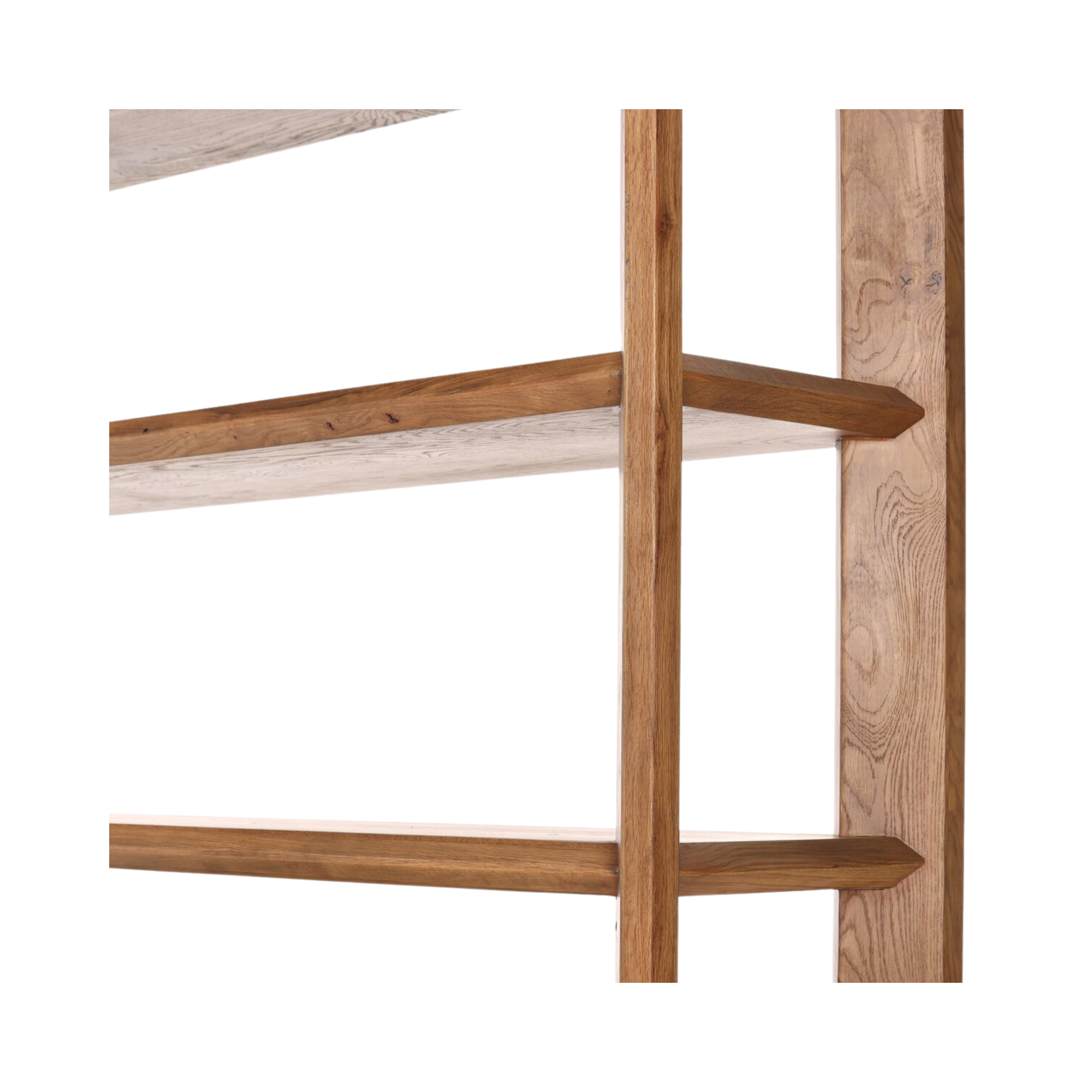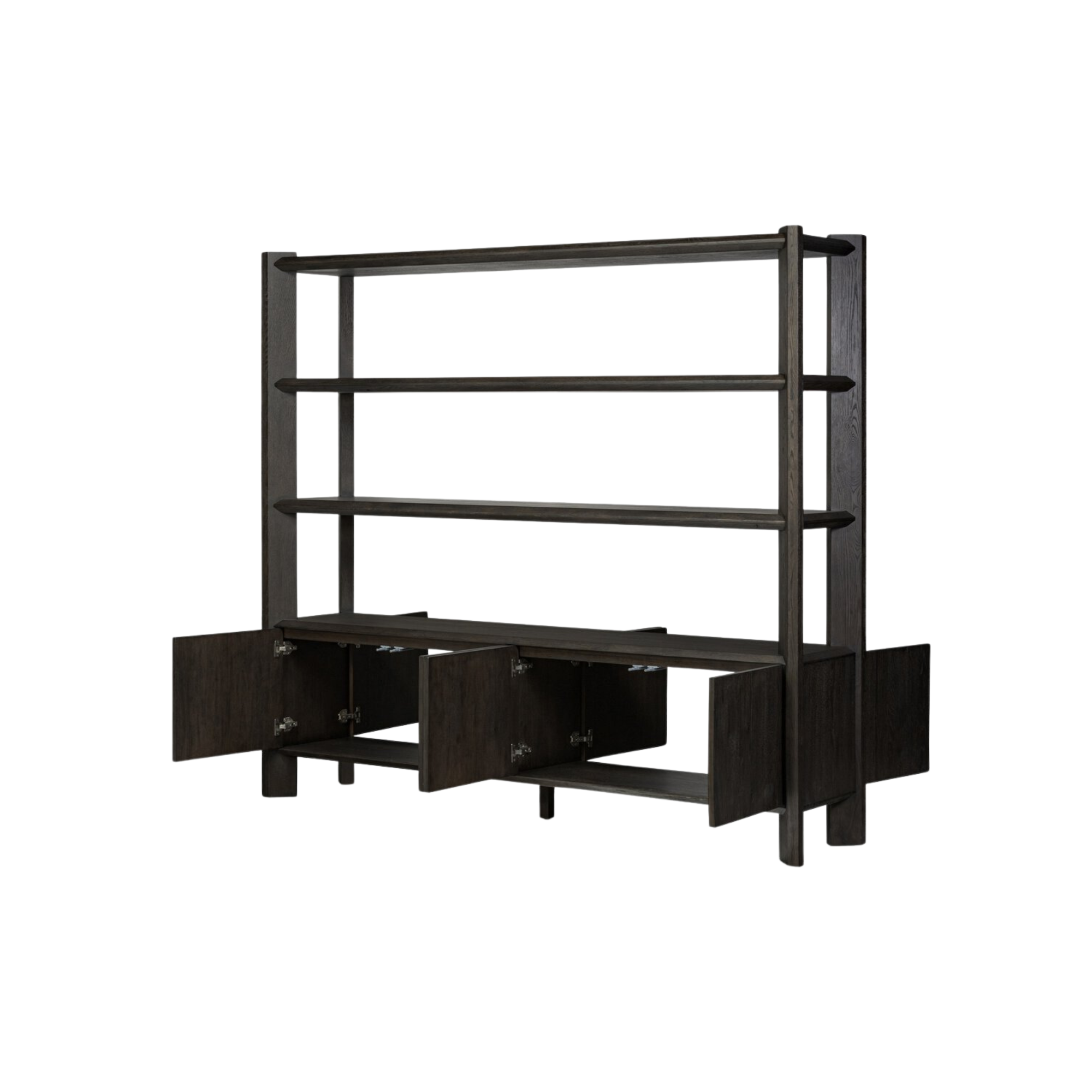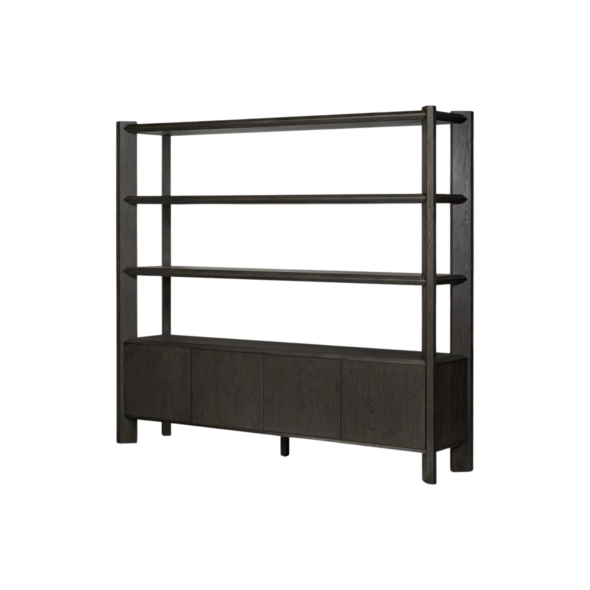 The Orwin Wide Bookshelf combines craftsmanship with design. Made from a blend of solid oak and thick oak veneer, it showcases chamfered edges along the shelves and angled outer legs. This overscale piece offers generous storage while adding a refined sense of movement to any space. Cabinets open from both sides, making this piece an excellent room divider. Perfect for displaying your collection with style.