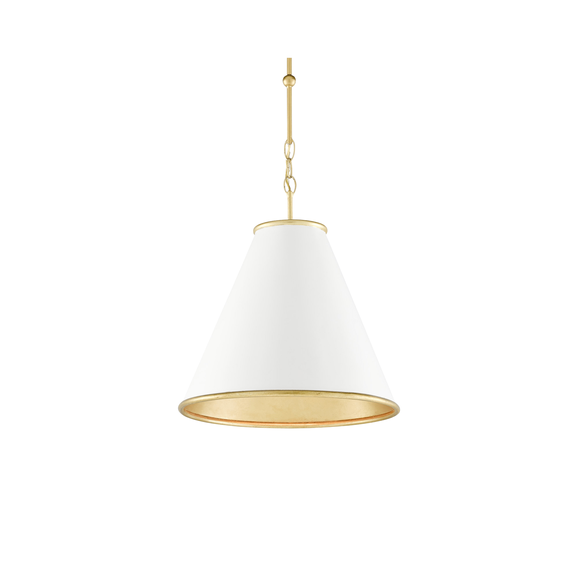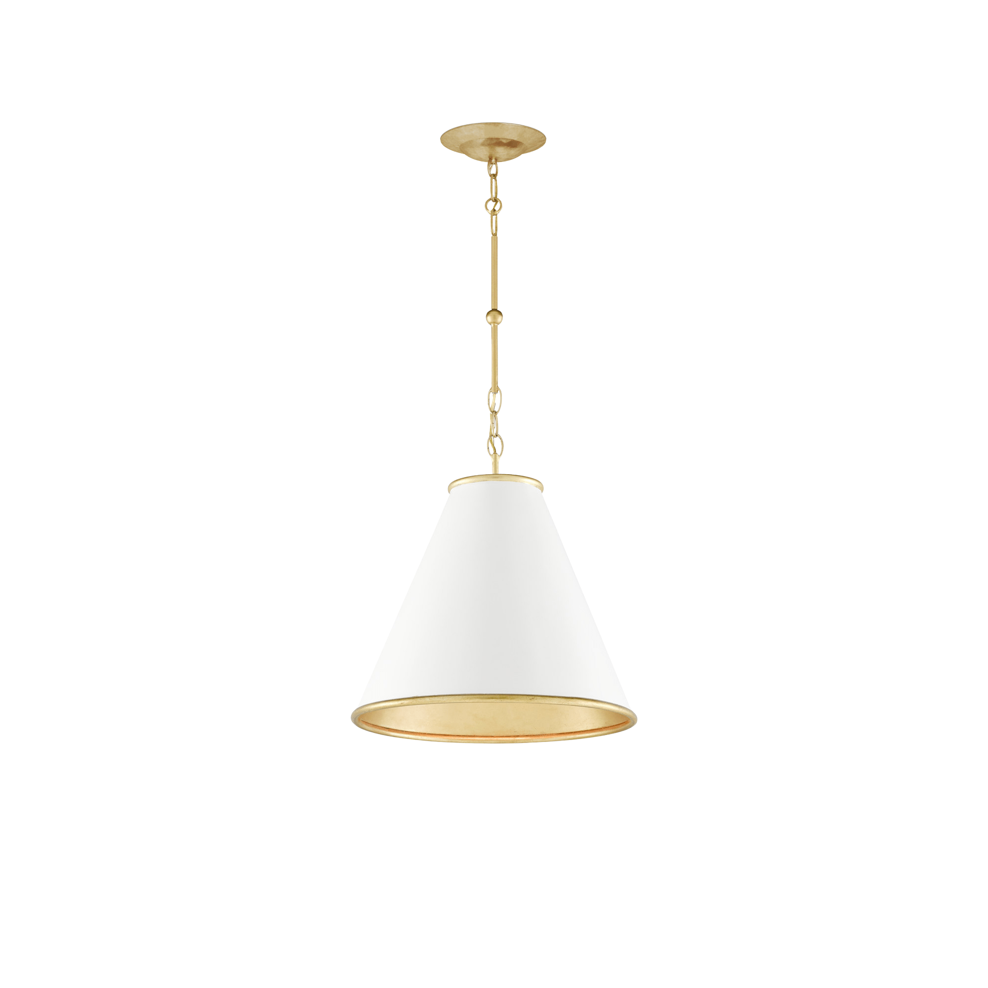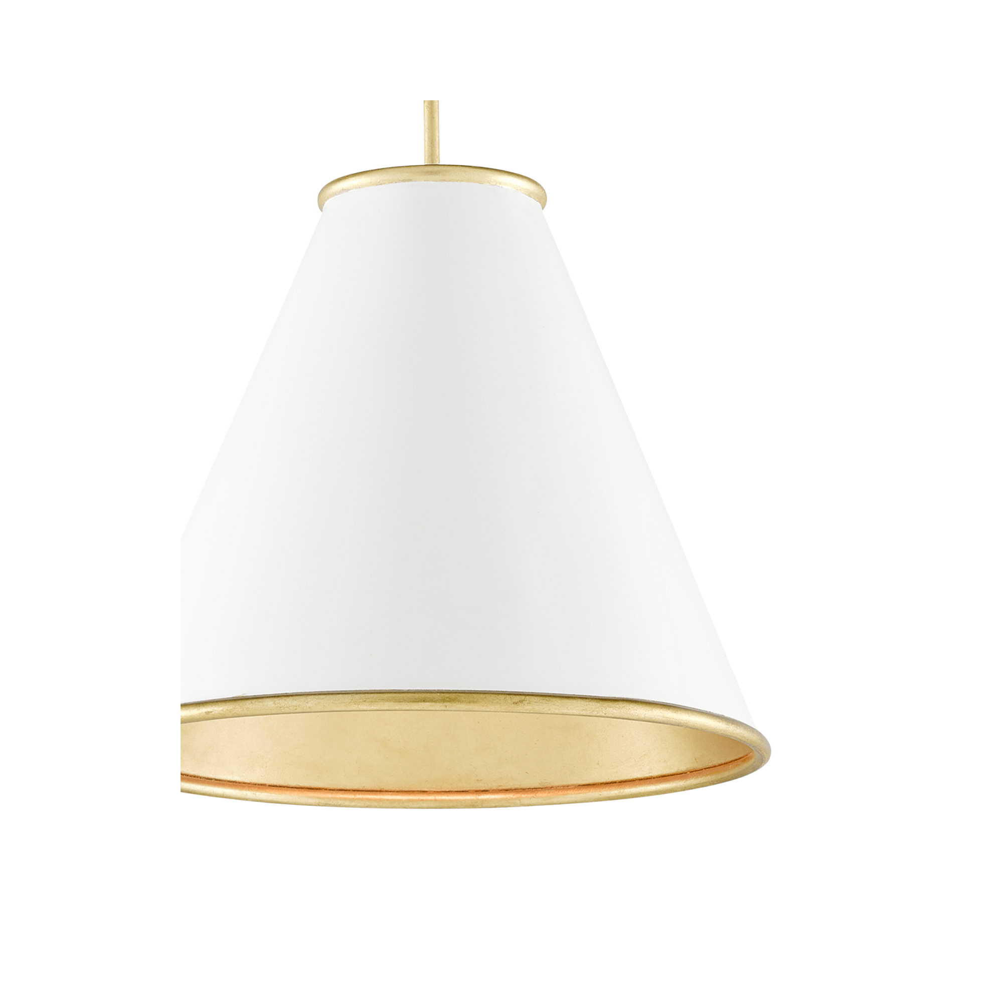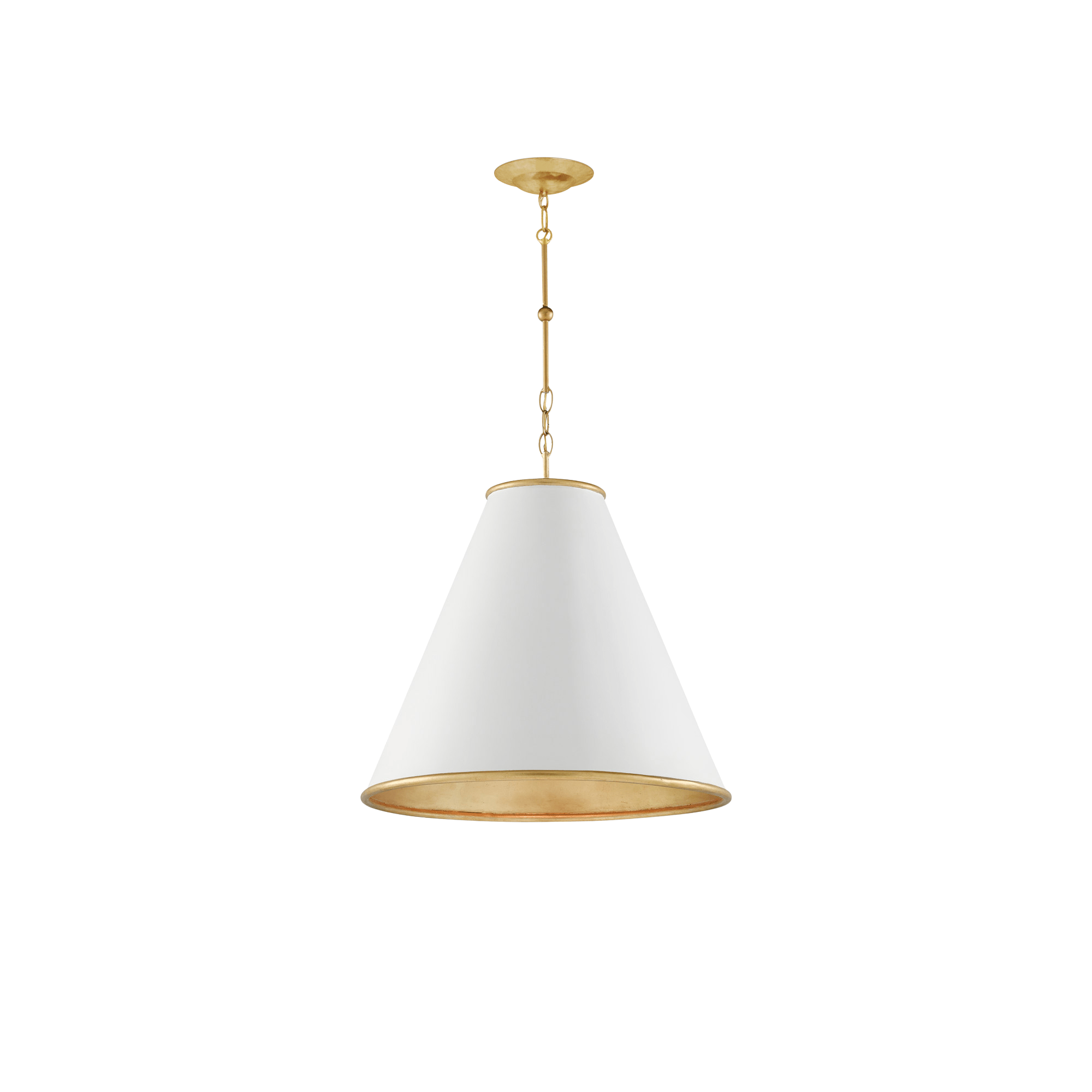 Our Pierrepont Pendant is made of wrought iron with a gesso white finish on its exterior and a contemporary gold leaf finish on the interiors of the shades. The rings connecting them gleam in a painted gold finish.