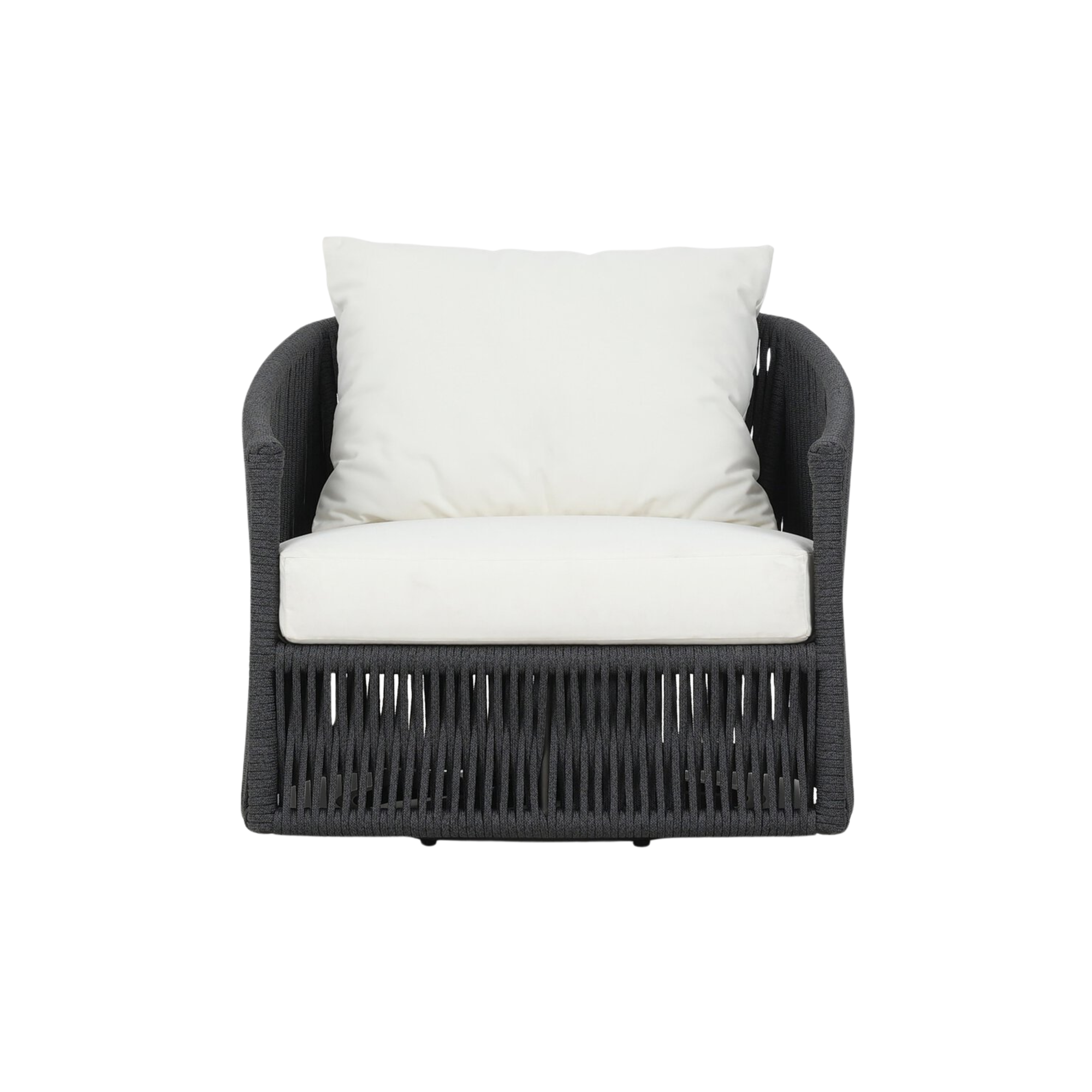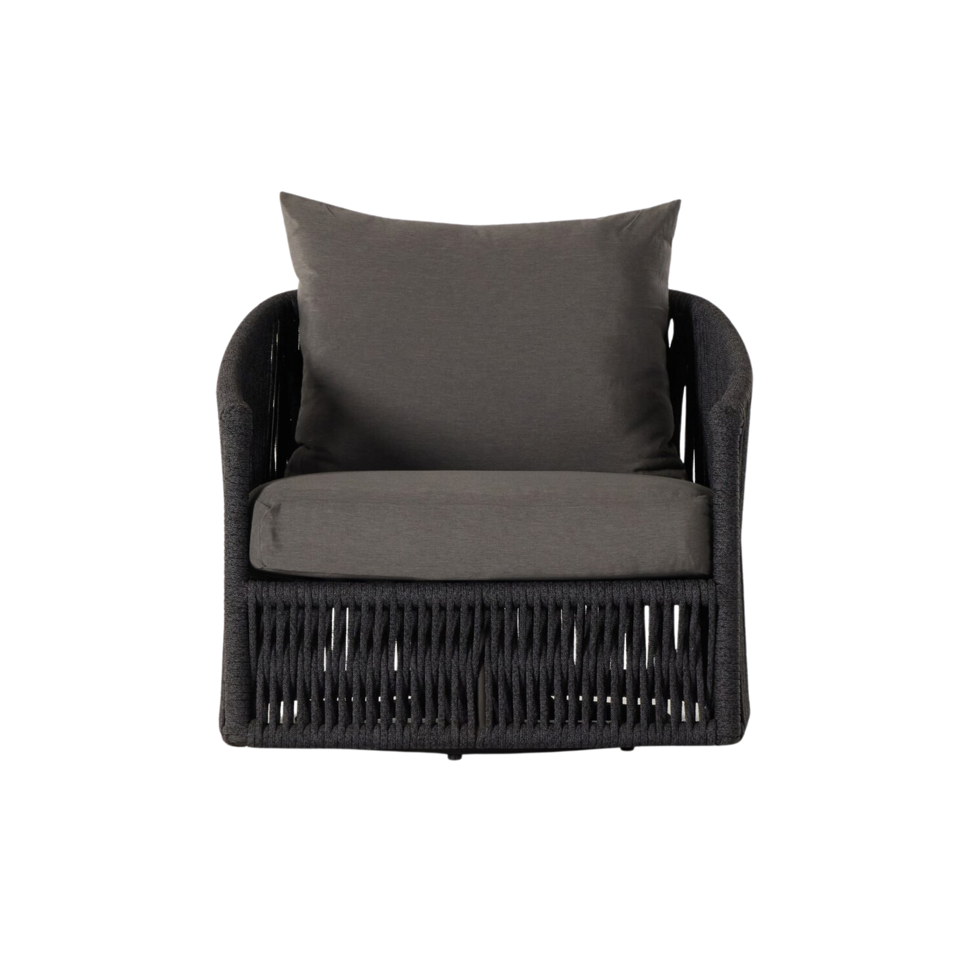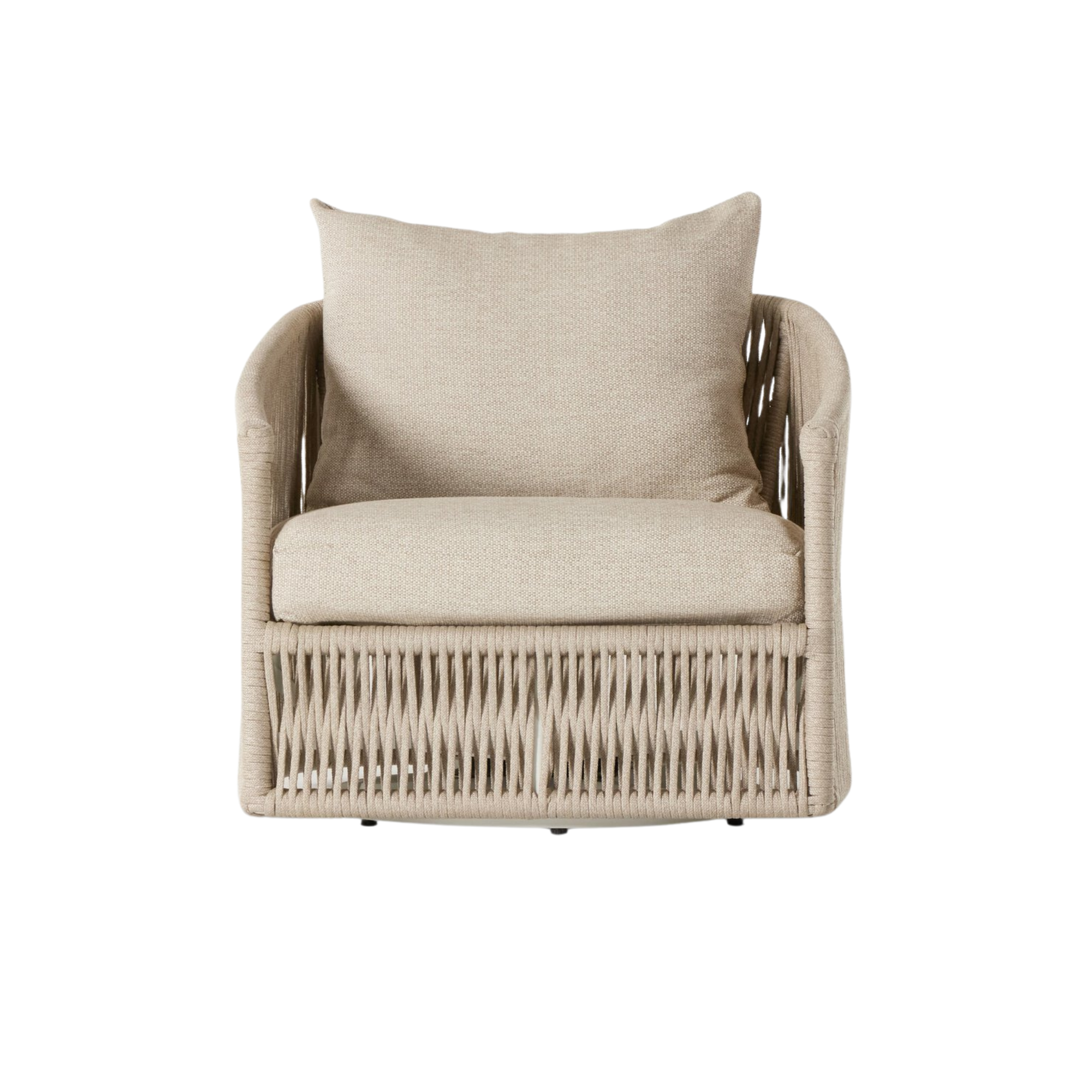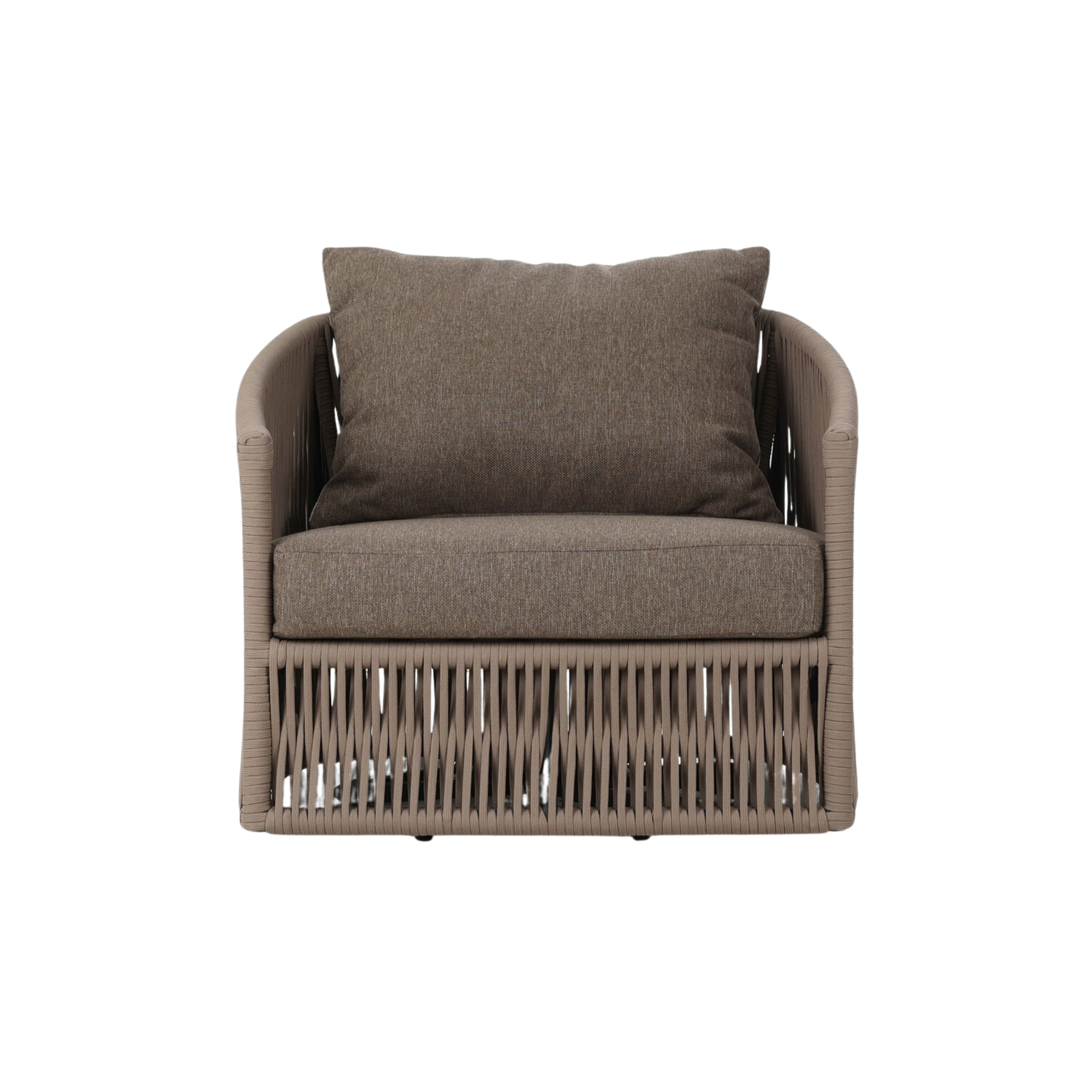A beautiful rope-based design is woven across a durable, 360-swivel aluminum frame in a rich bronze finish. Topped with a wide cushion and throw pillow, all upholstered in 100% olefin, known for its UV-resistant, water-repellent and quick-drying abilities. Cover or store indoors during inclement weather and when not in use.
