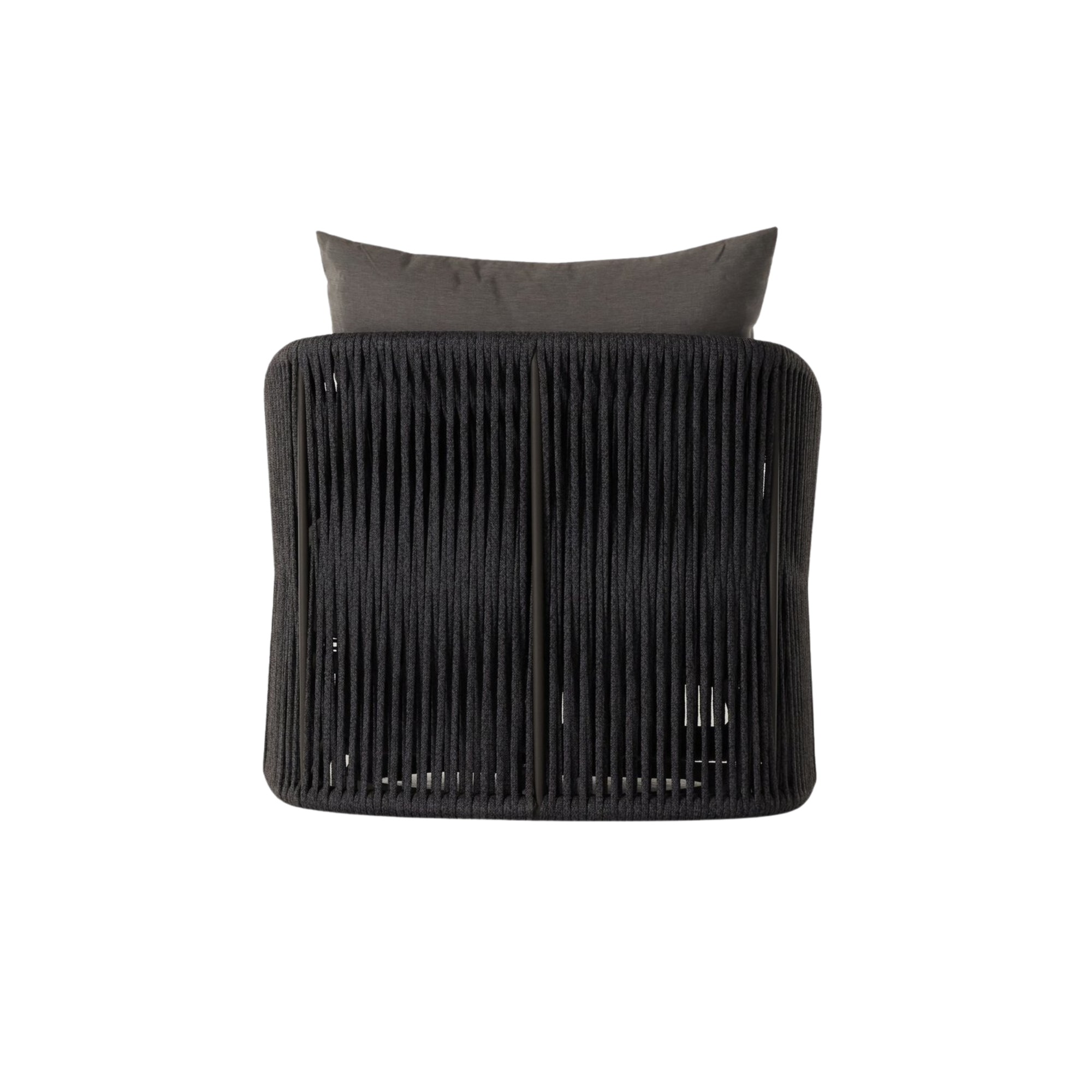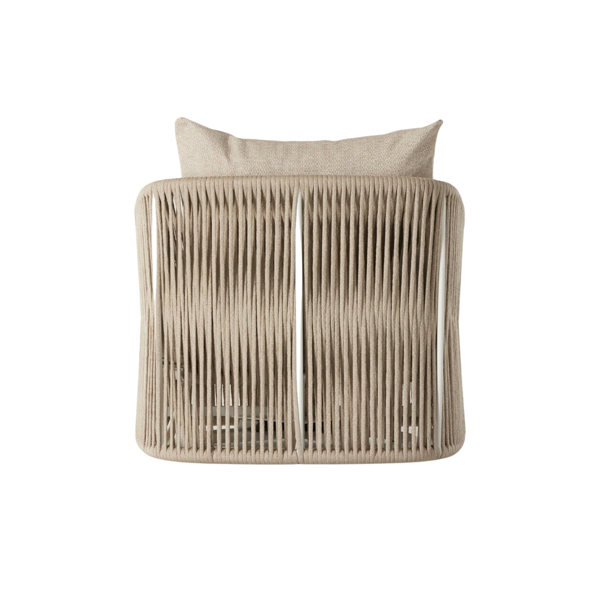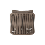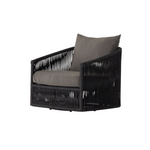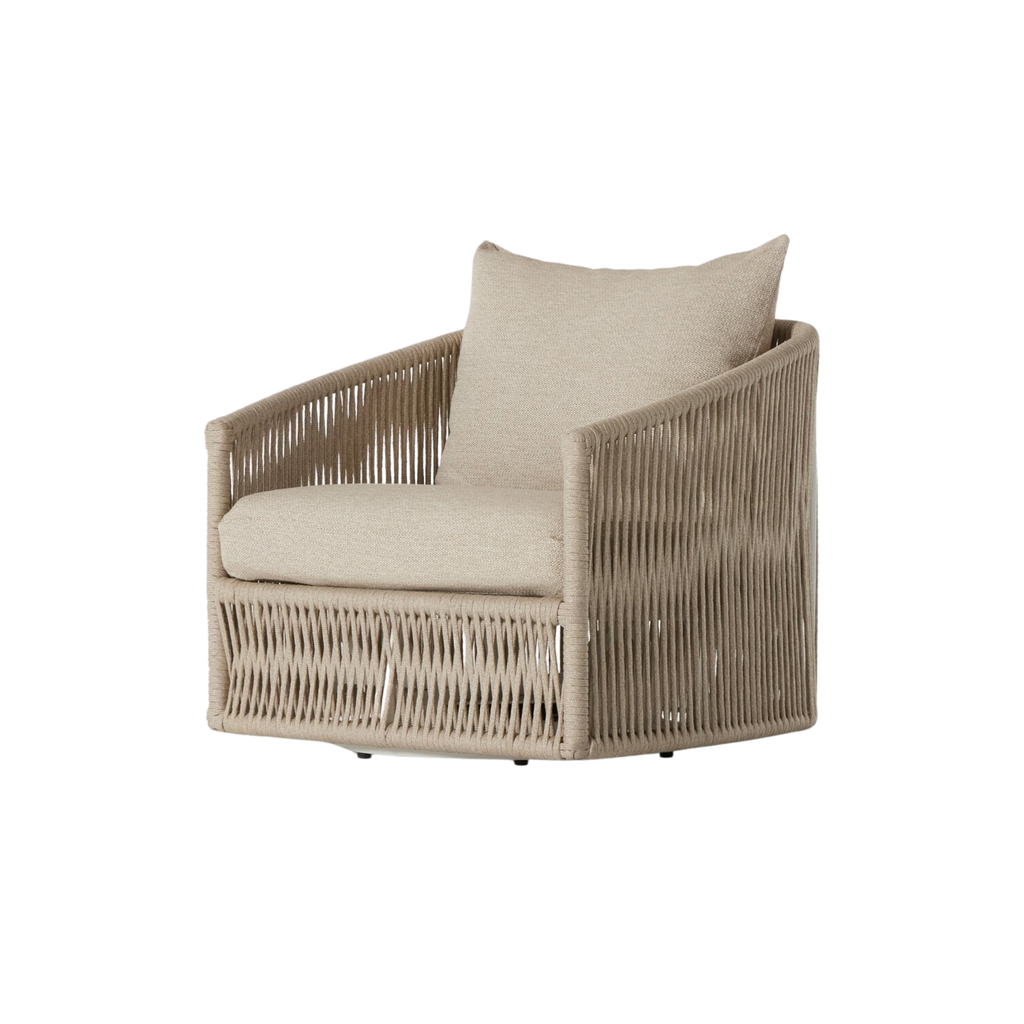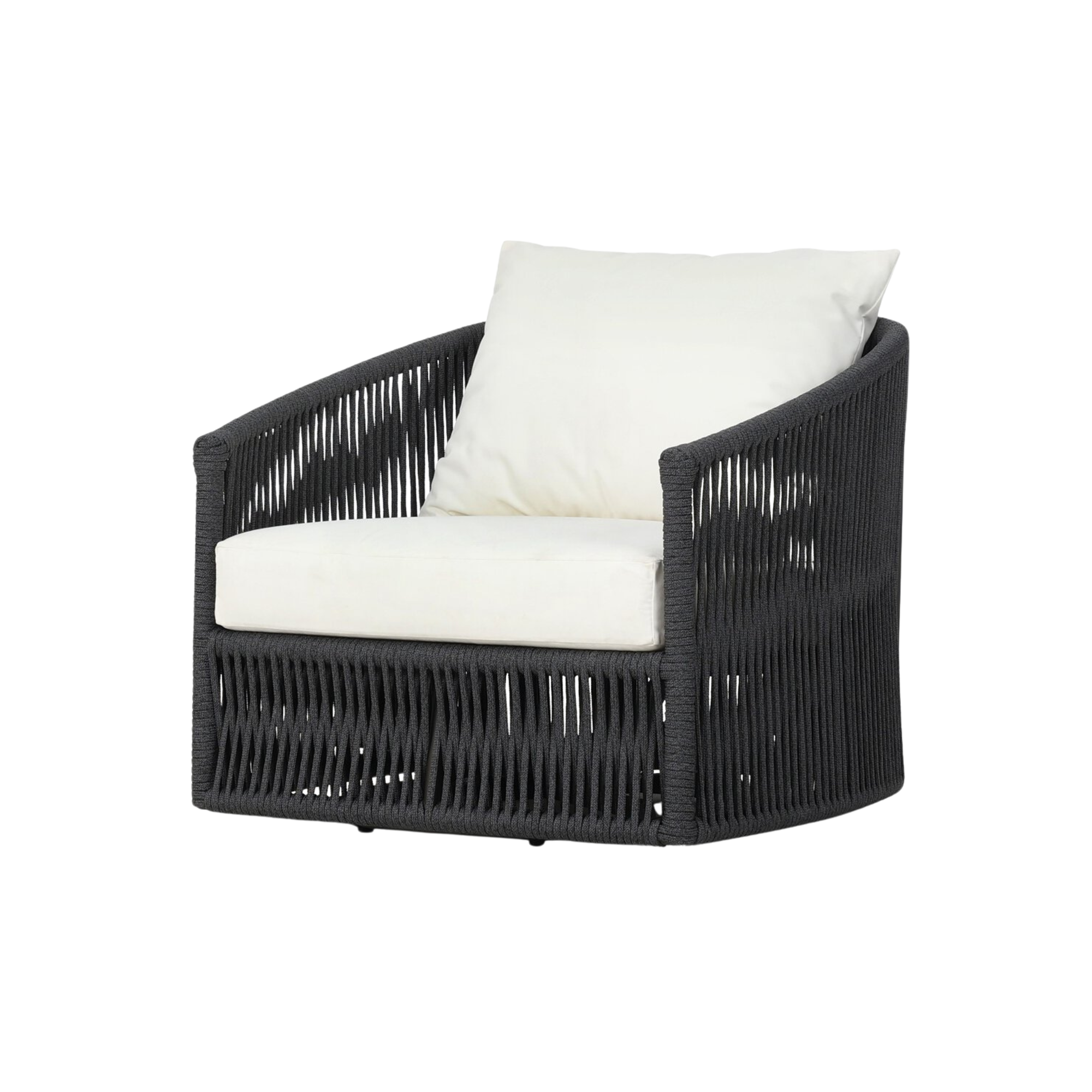 A beautiful rope-based design is woven across a durable, 360-swivel aluminum frame in a rich bronze finish. Topped with a wide cushion and throw pillow, all upholstered in 100% olefin, known for its UV-resistant, water-repellent and quick-drying abilities. Cover or store indoors during inclement weather and when not in use.