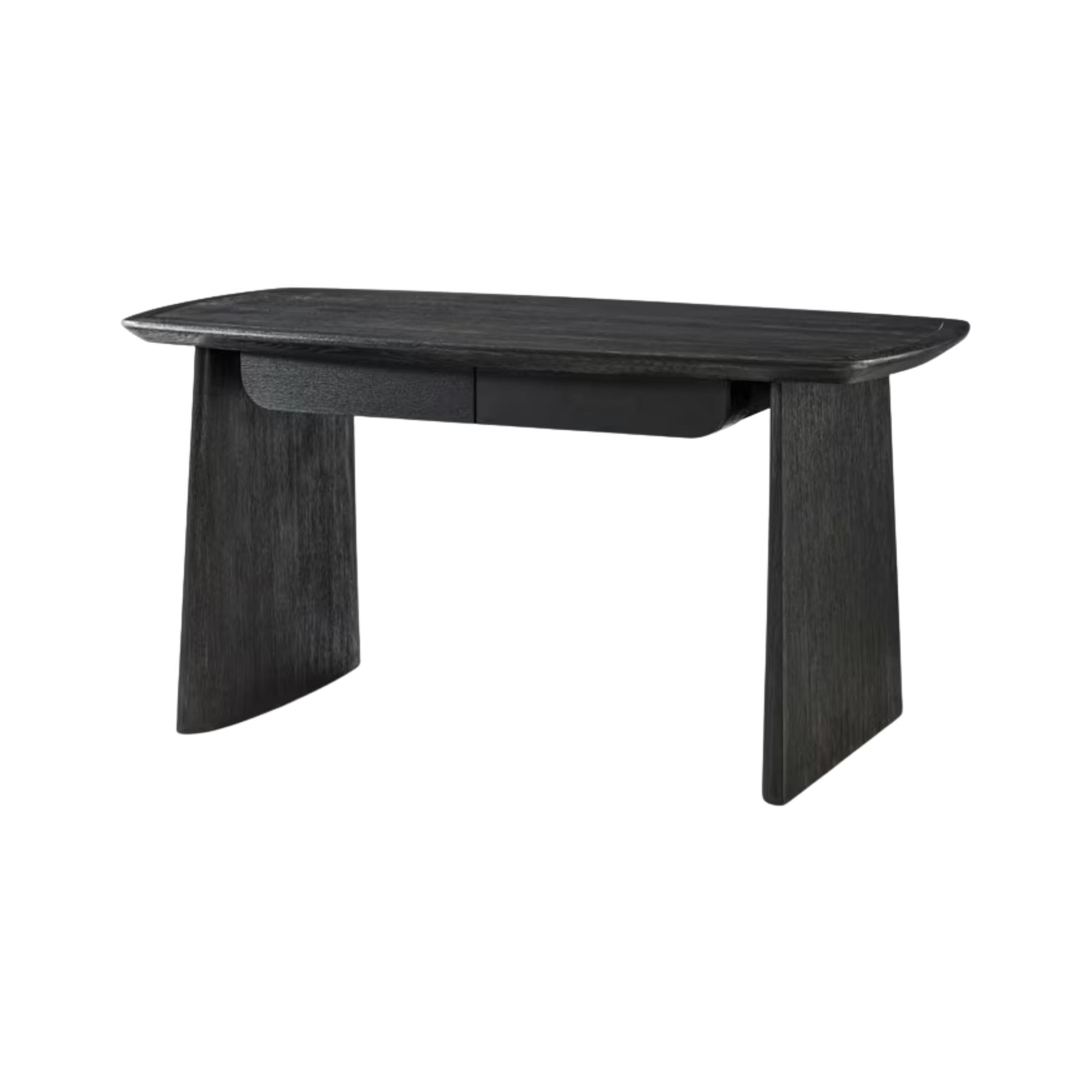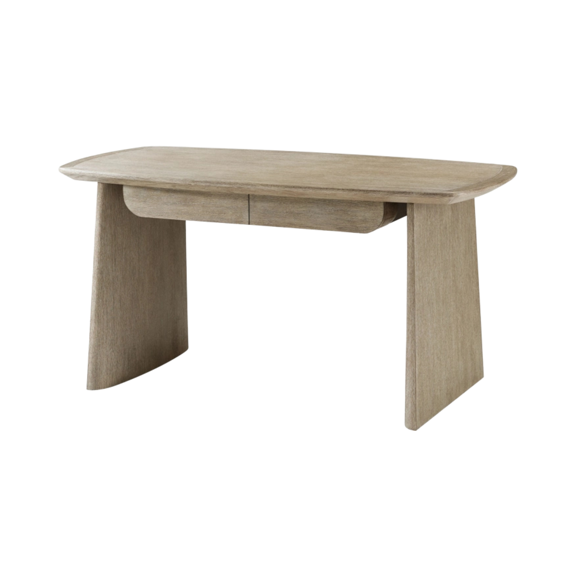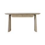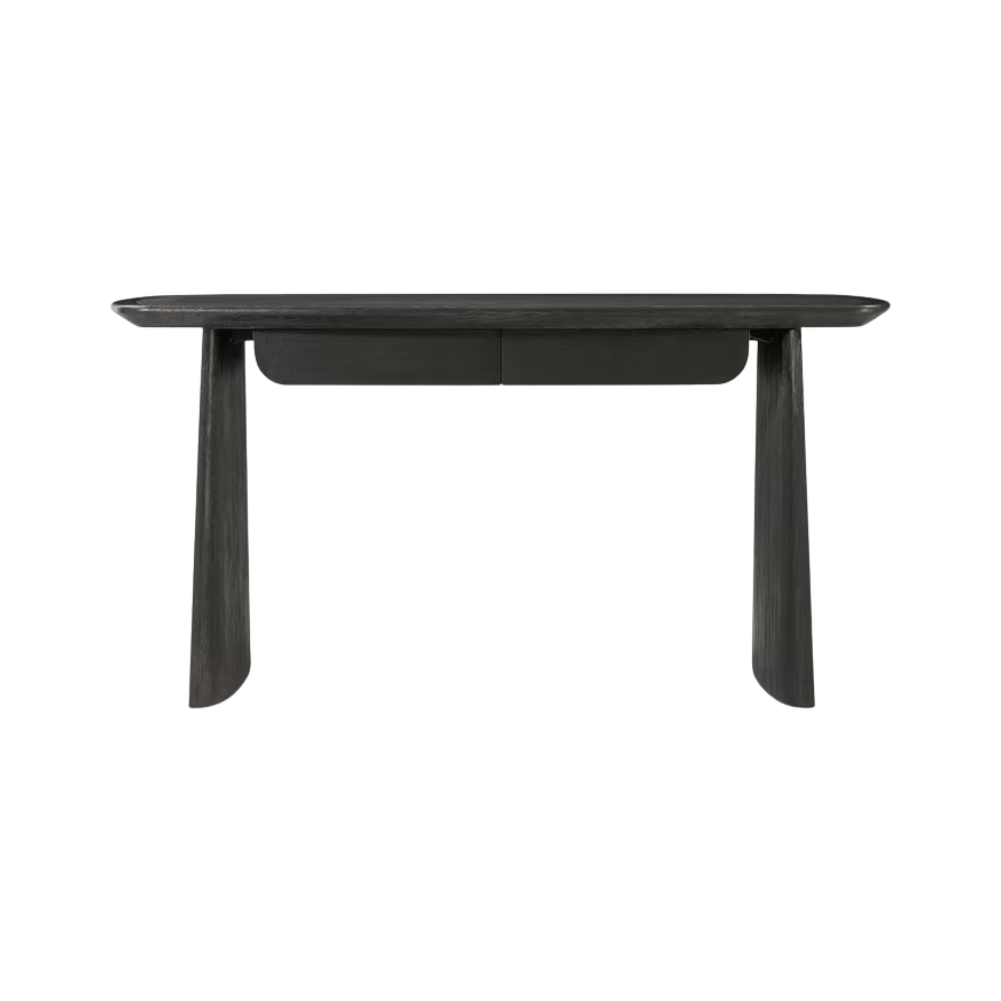The Repose Desk features a subtly rounded, barrel shaped top with alternating quarter straight-cut Oak veneers. The Repose Desk stands squarely on solid trapezoid-style legs with two easily accessible drawers for tucking away all of your essentials.