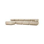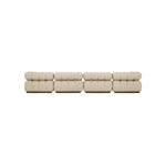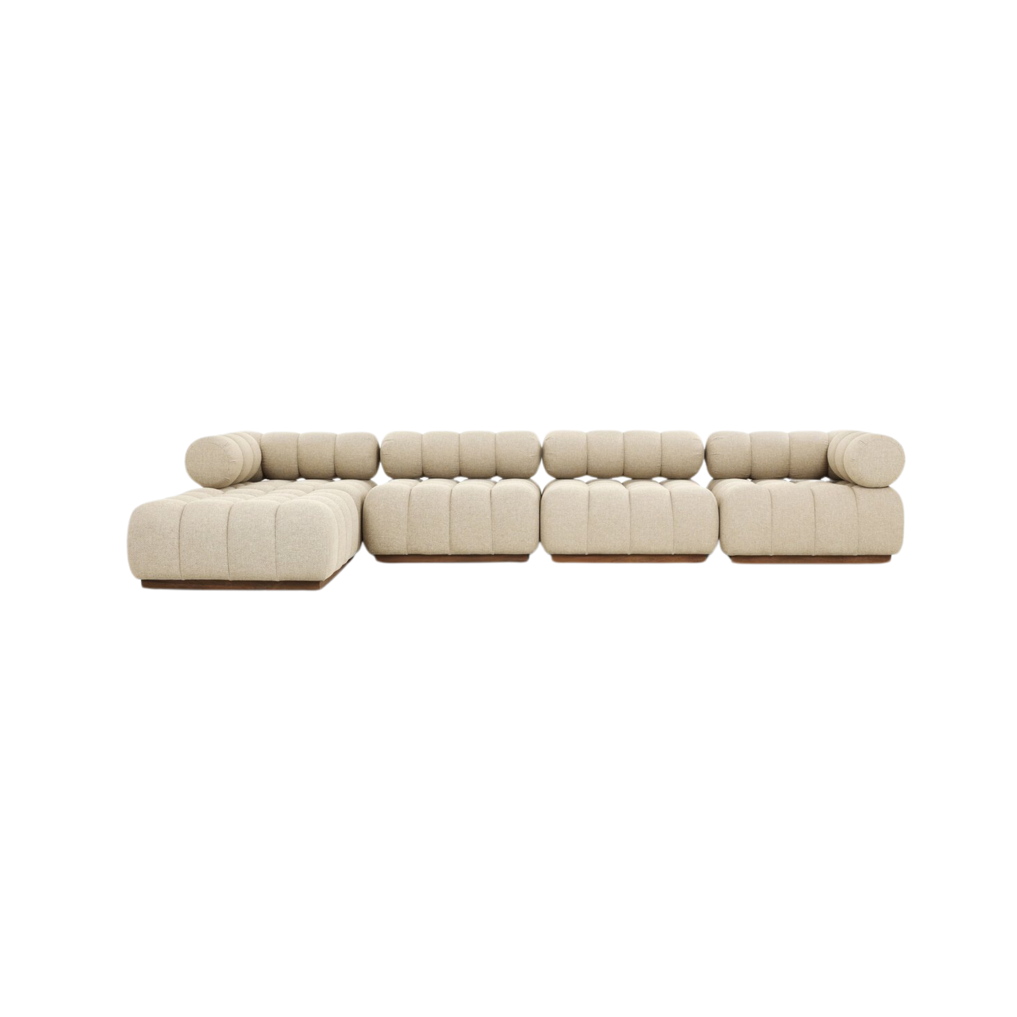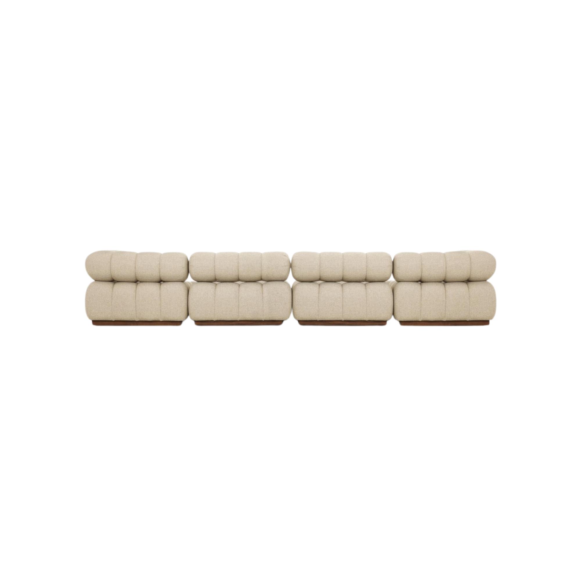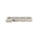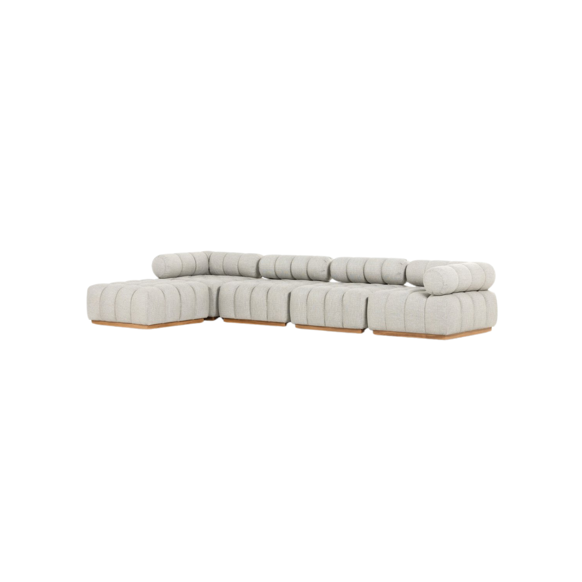A modern take on mid-century Italian design, soft volume and exaggerated proportions fuse for a sculpted look and playful feel. Atop a plinth-style teak base, outdoor-friendly four-piece sectional features dramatic tufting for a padded sit, indoors and out. Sustainably made with zero waste, luxurious Italian upholstery places a new and unique spin on indoor/outdoor seating, offering soft, durable fabric that's highly resistant to sun, stains, mold and abrasion. Cover or store indoors during inclement weather and when not in use. Ottoman not included.