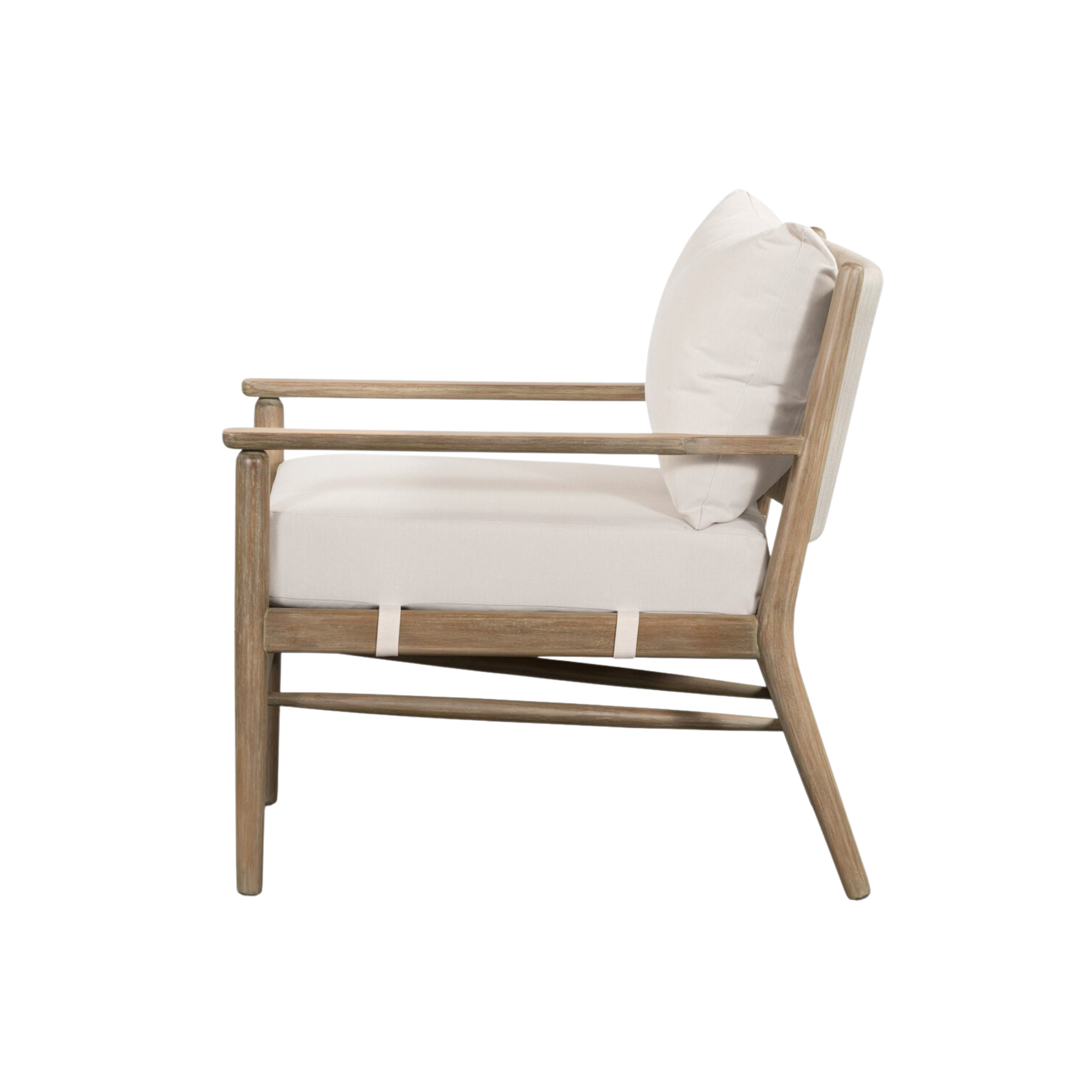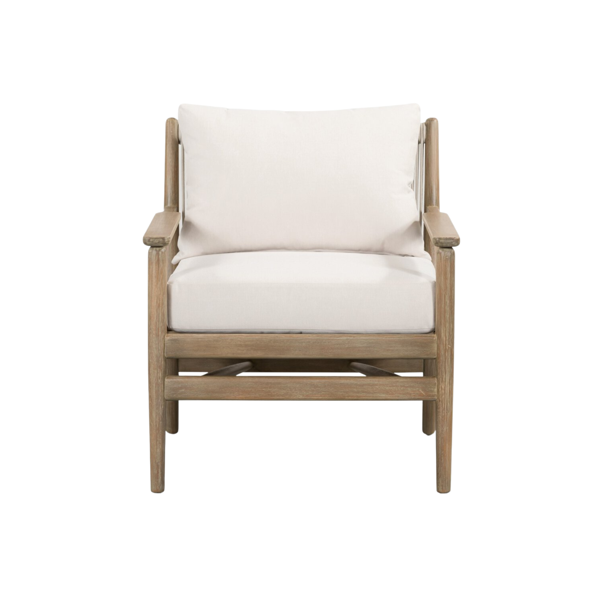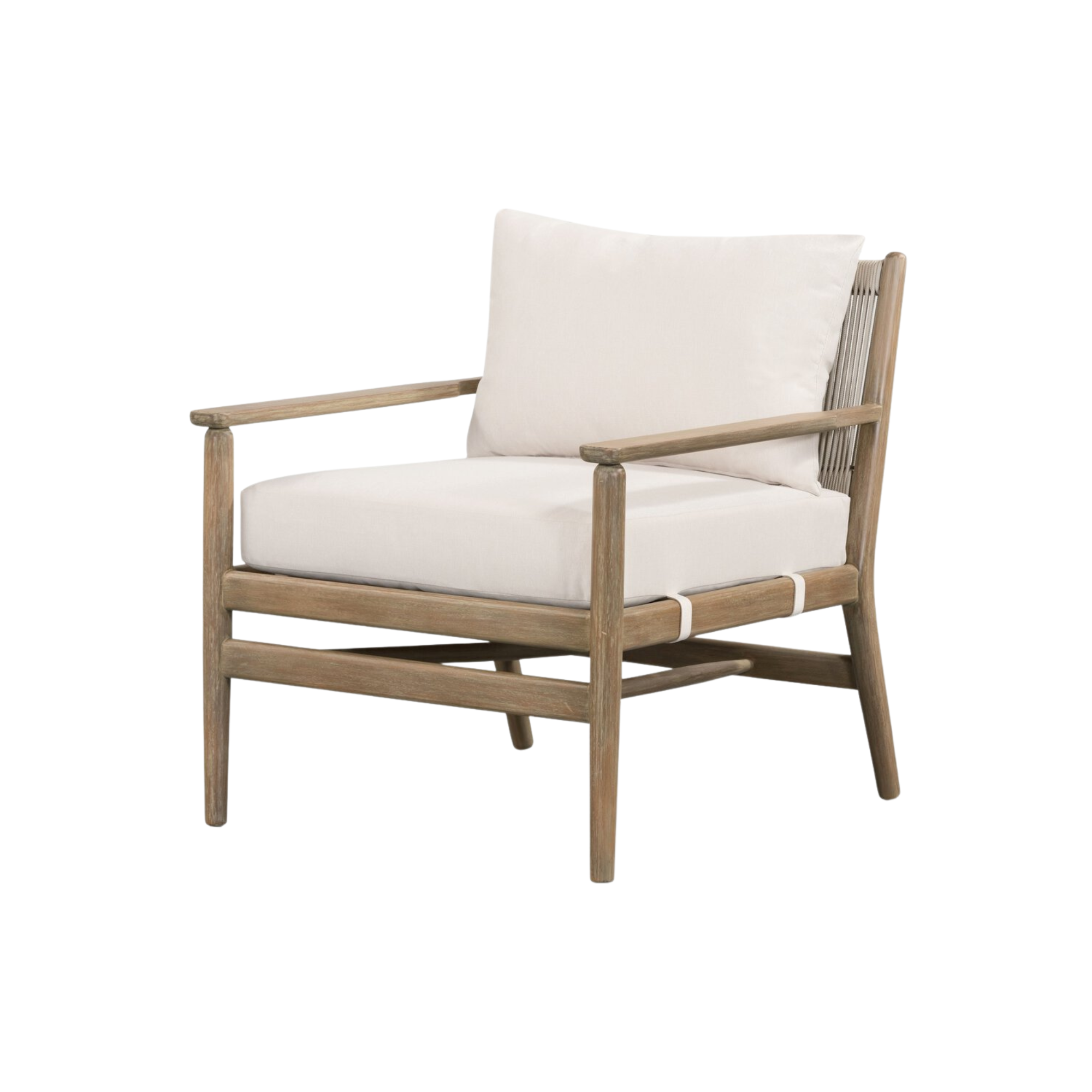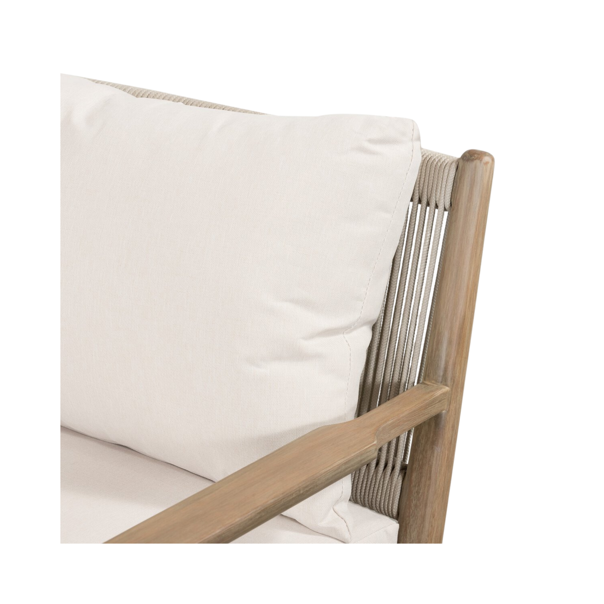 Crafted from FSC-certified eucalyptus, the Rosen Outdoor Chair melds sustainability with design. Its tapered legs and paddle arms create a structured silhouette, while durable, velcro-secured box cushions ensure comfort and longevity outdoors. The linear rope detailing on the back introduces a unique texture, enhancing the visual appeal and craftsmanship of these chairs. Ideal for outdoor spaces, this chair balances elegance with practical durability. Cover or store when not in use.