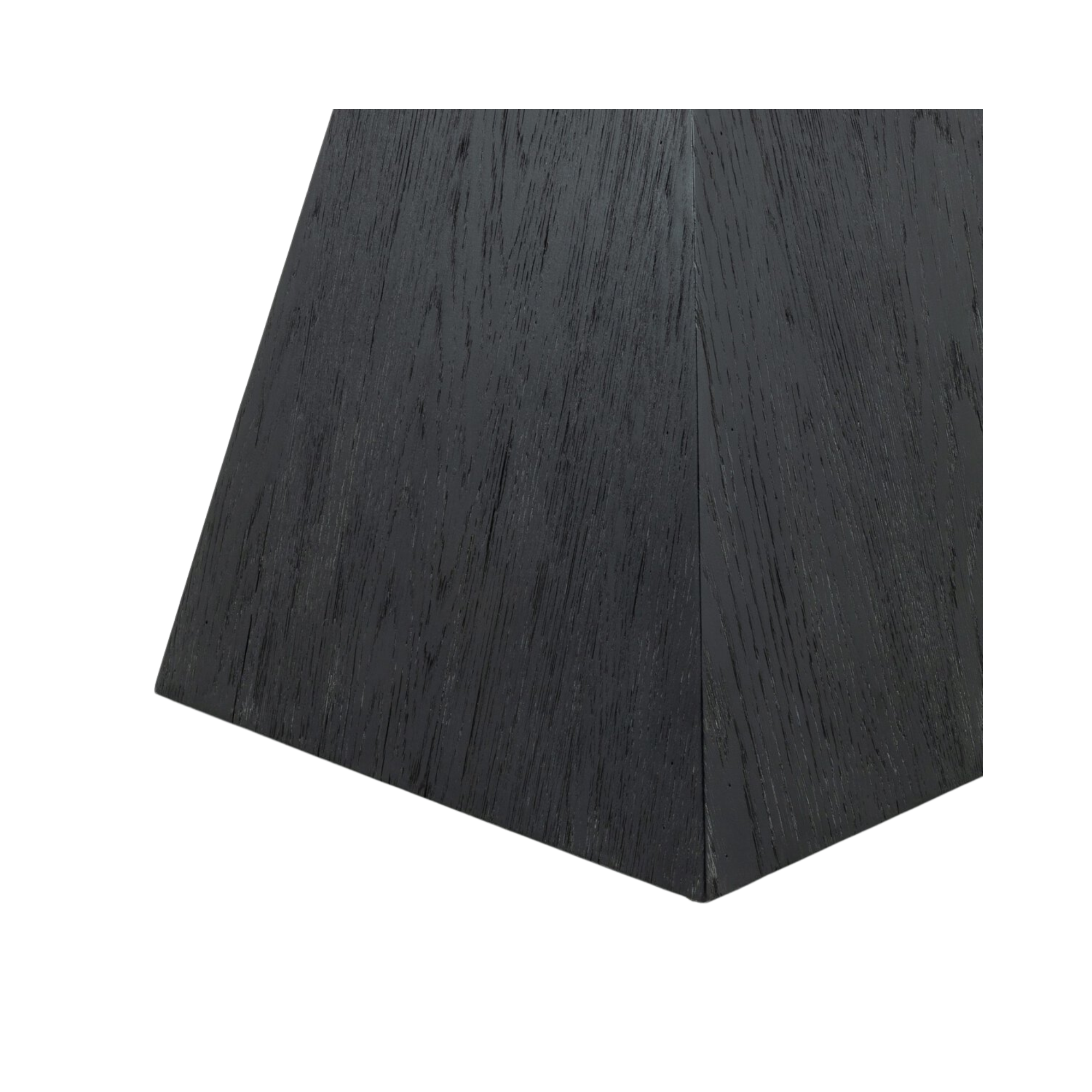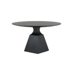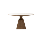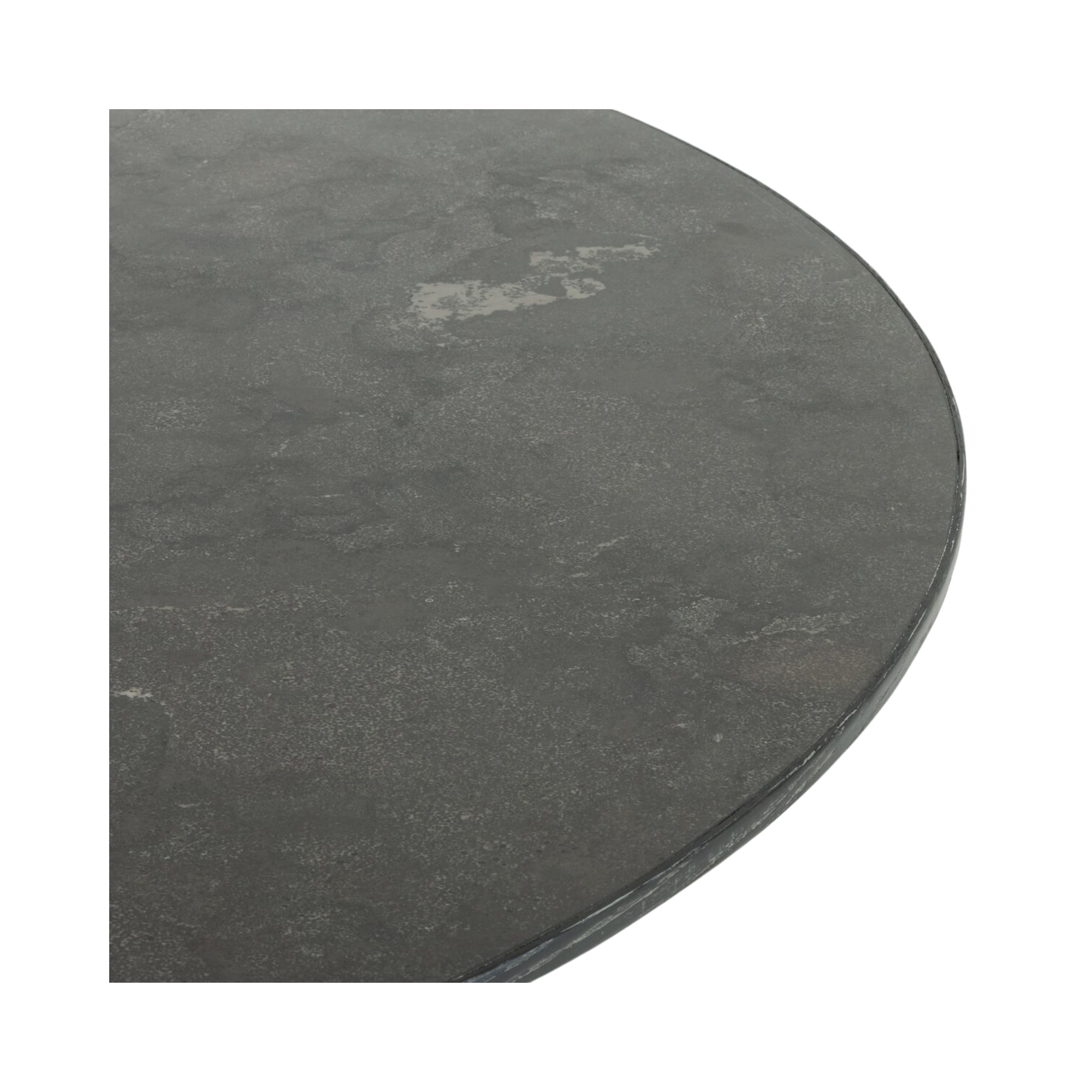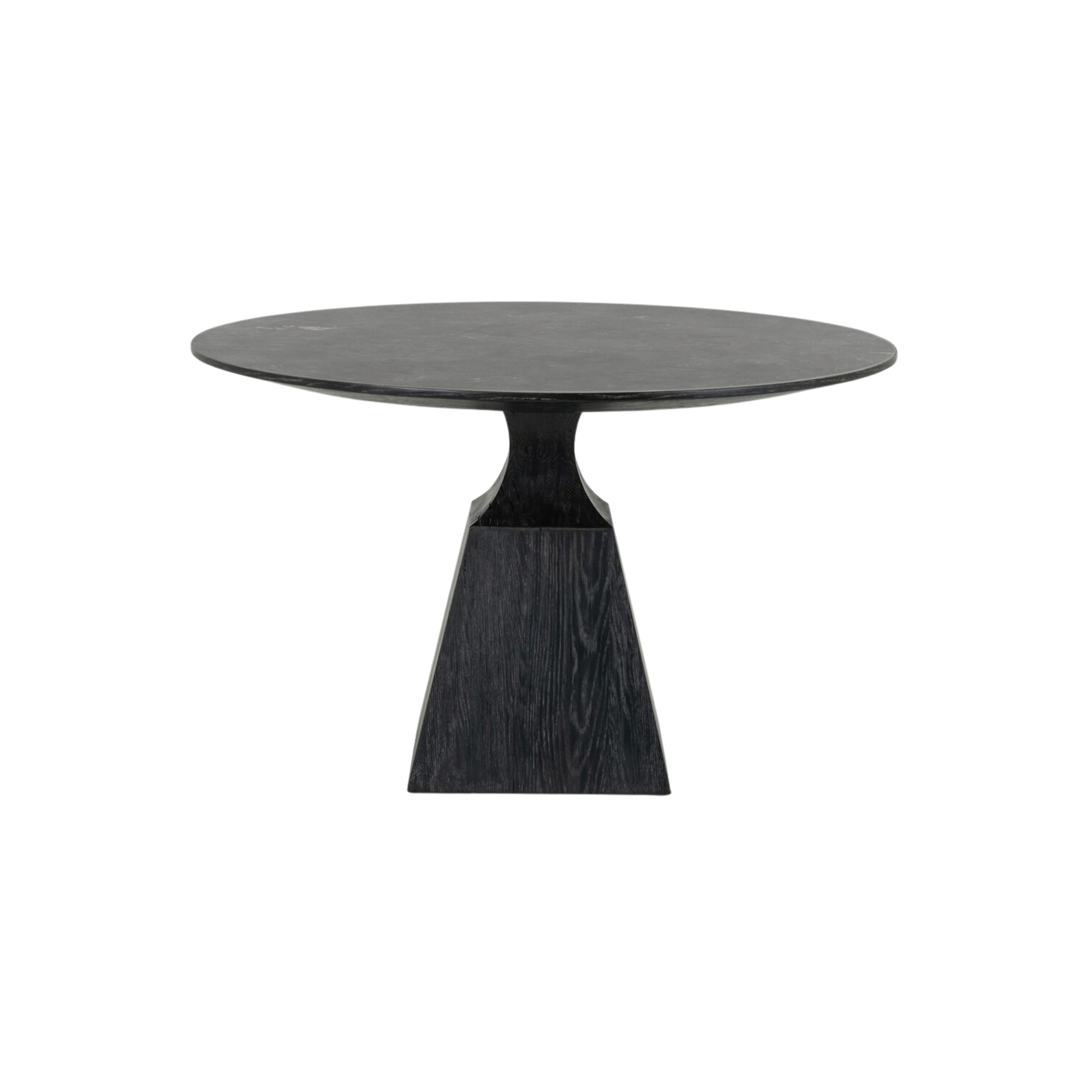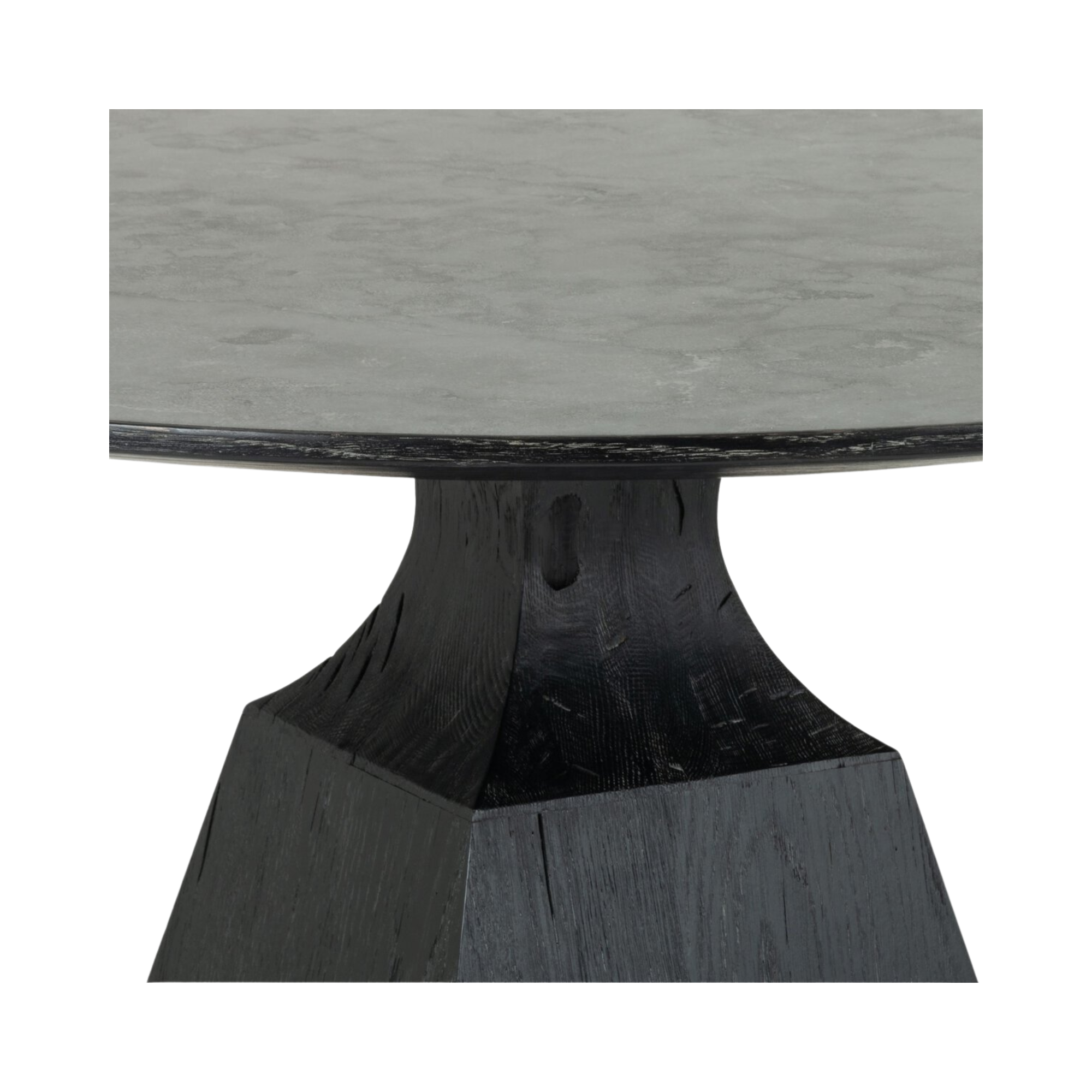 A bell-shaped pedestal base of oak is wire-brushed for extra texture, while a rounded top of stone brings a touch of industrialism to the table. Mineral lines and subtle color, texture and pattern variations are to be expected and speak to each stone's individual nature.