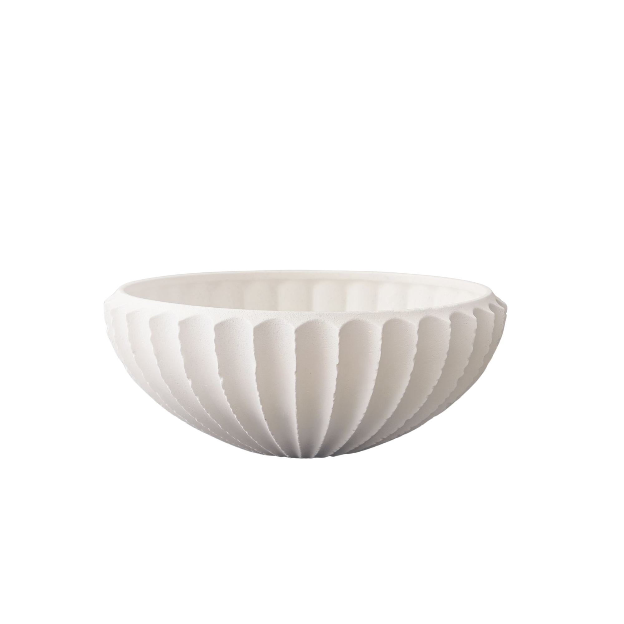 The Sawtooth Bowl features crisp, symmetric ridges that highlight its rounded form. Crafted from textured, matte white Portuguese ceramic, this large-scale bowl combines artisanal quality with a minimalist aesthetic, making it a sophisticated addition to any interior setting or tablescape.