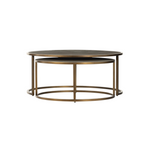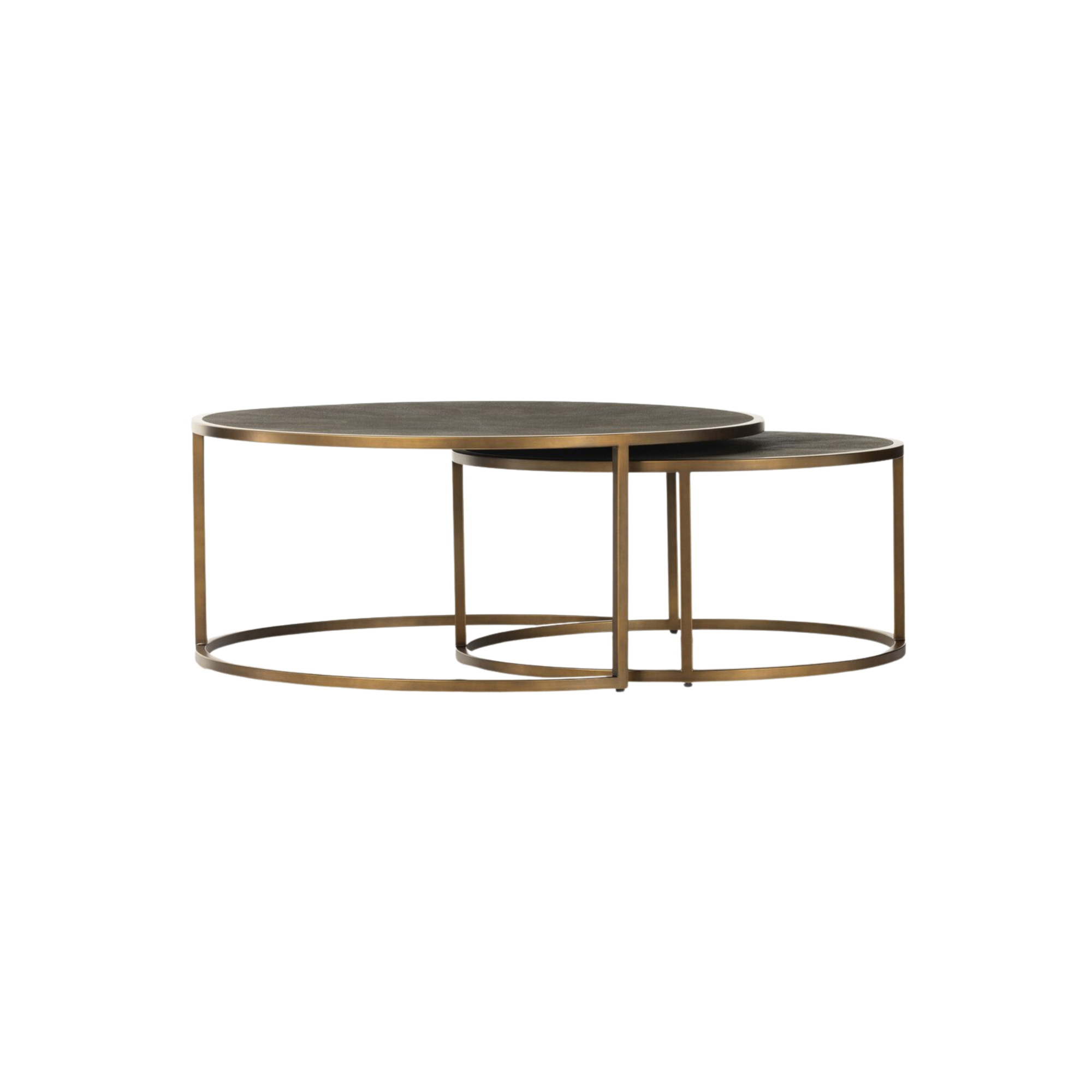 The Shagreen Nesting Coffee Table features an antique brass-finished iron frame, curved like a crescent, creating a stylish home for its smaller companion table. Its grey-green resin faux shagreen top adds a luxury texture that complements the clean design. This set offers versatile functionality, perfect for enhancing any living space with a touch of refined style. Large Table Dims: 38"w x 38"d x 16"h Small Table Dims: 30"w x 30"d x 14"h