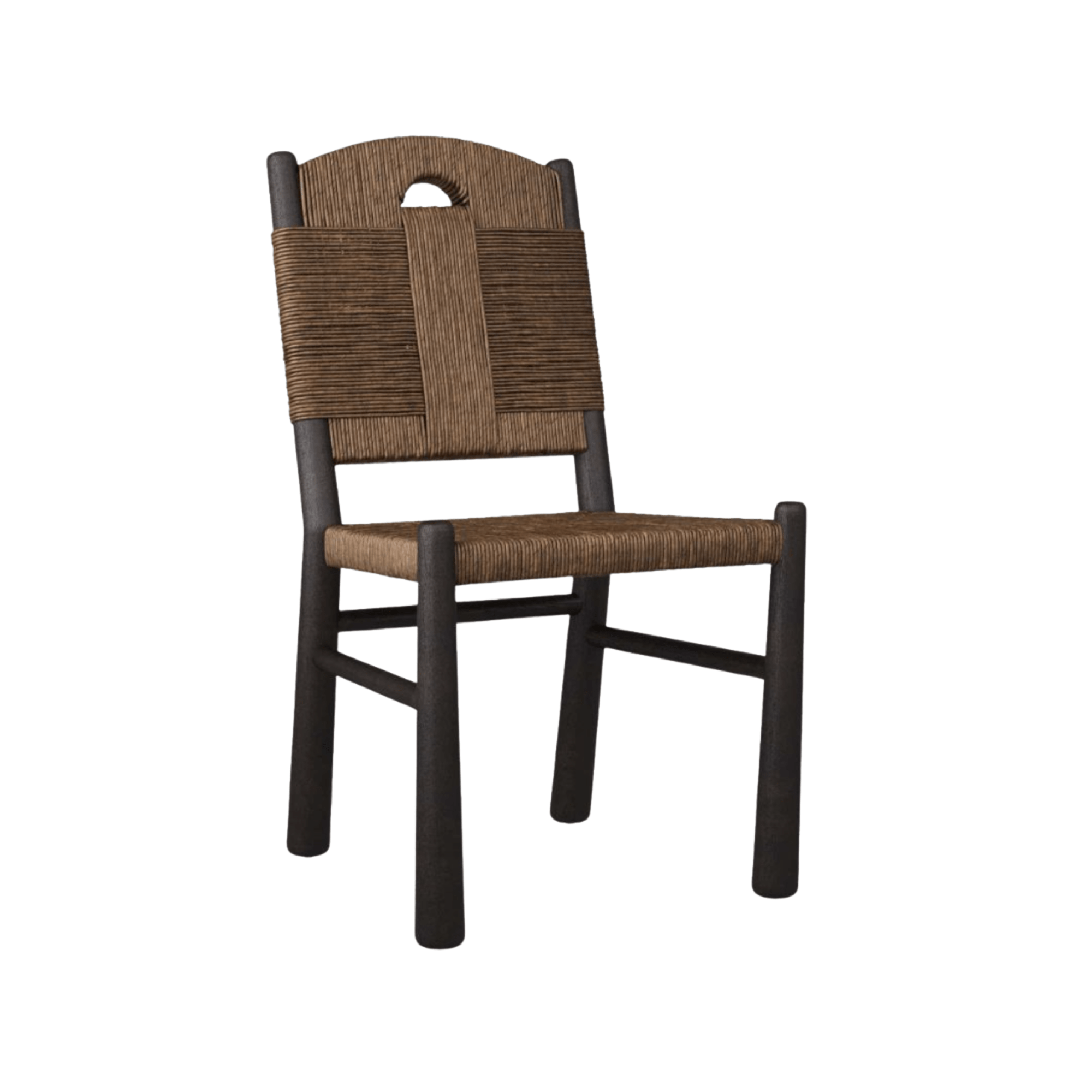 The Solange dining chair is rendered in playful shapes and artisanal materials. The clever chair, created in sable finished mango wood and woven, tobacco-washed paper cord, features a carved opening at the top of the frame for easy carriage from room to room. Finish will vary.