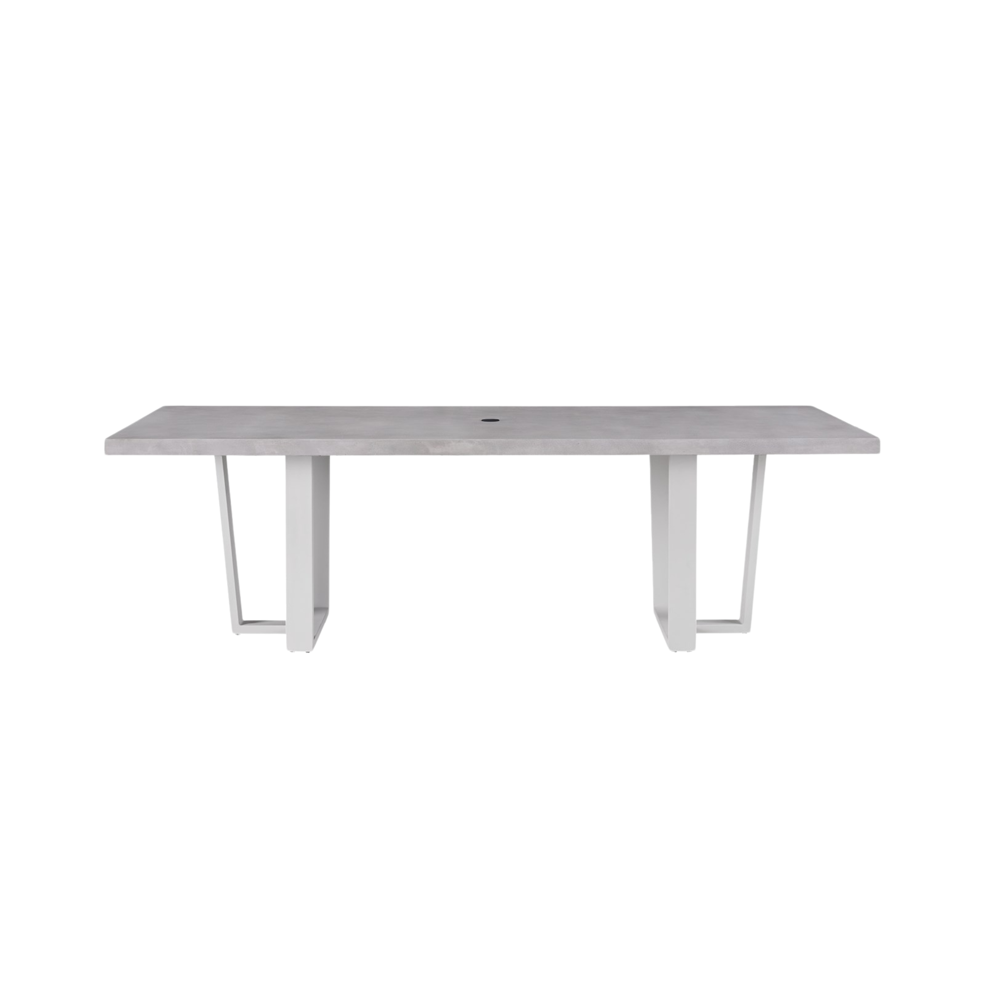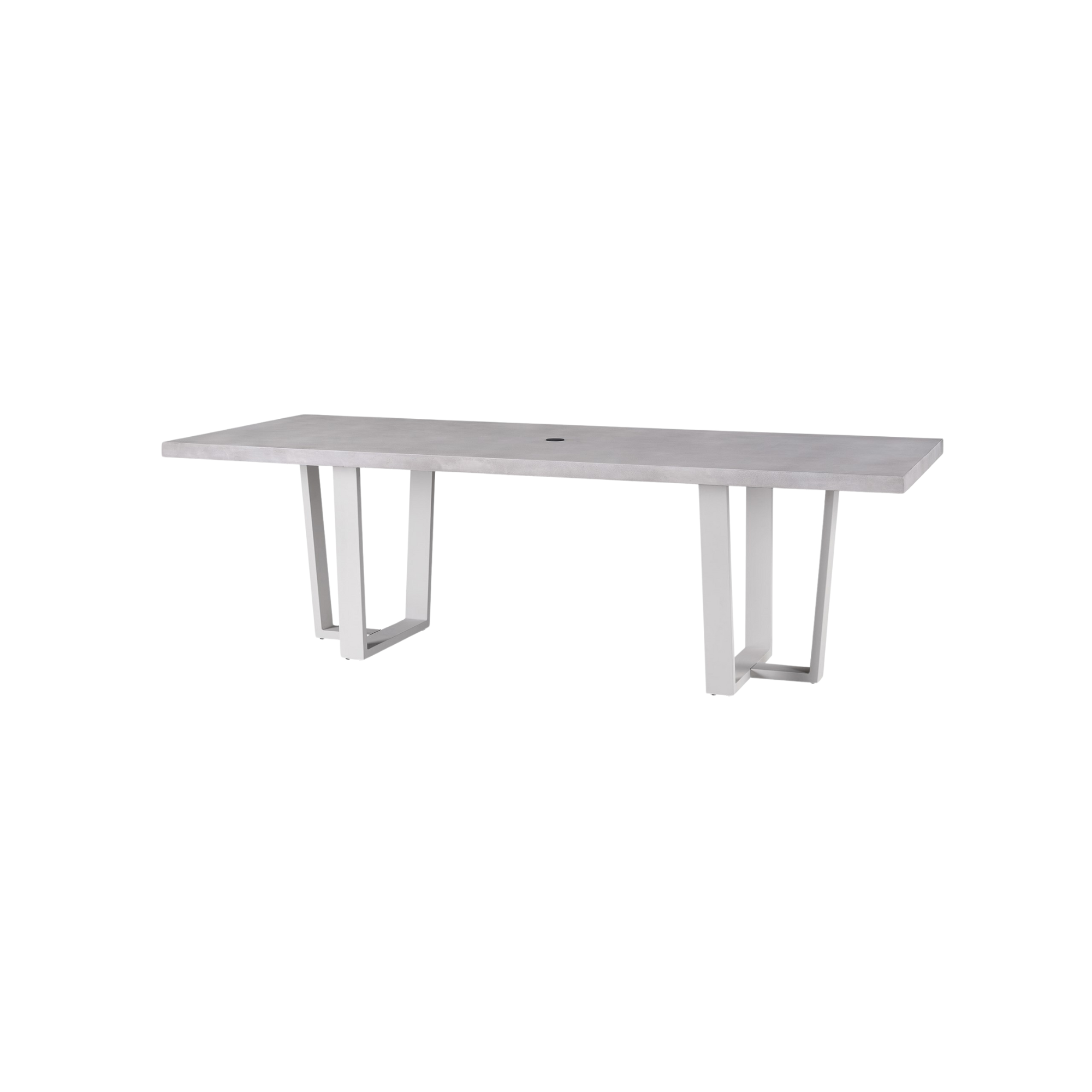 A large cast concrete top is accentuated by a sleek metal base in the South Beach Dining Table, a breezy statement piece with a modern silhouette.