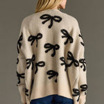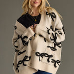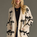 This tan button-up cardigan features a stylish black bow design on both the front and back, creating a sophisticated look. Made from 100% acrylic, it offers warmth and easy care, making it an excellent choice for layering throughout the seasons. Its classic button closure ensures versatility in styling, perfect for casual or professional outfits with a refined touch.