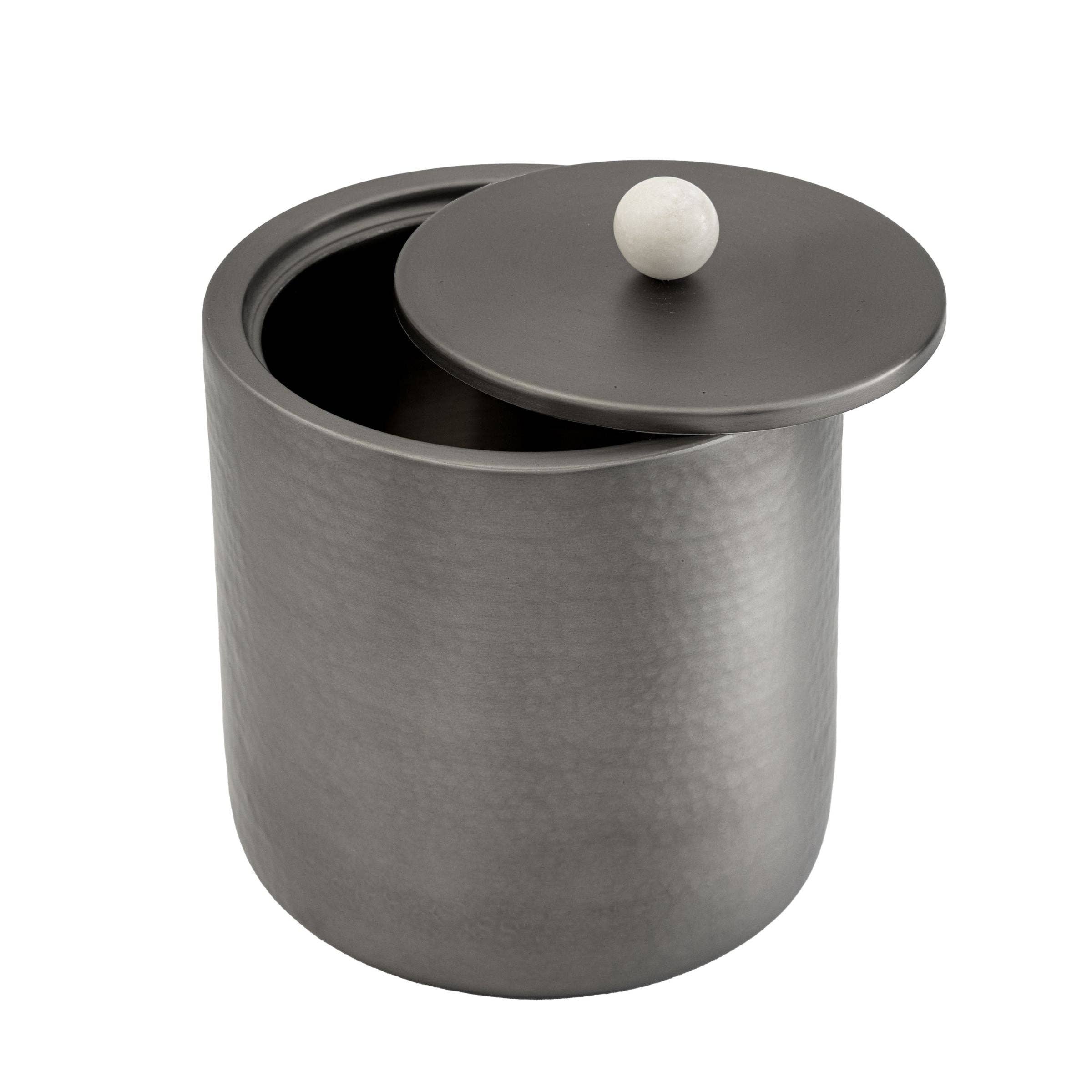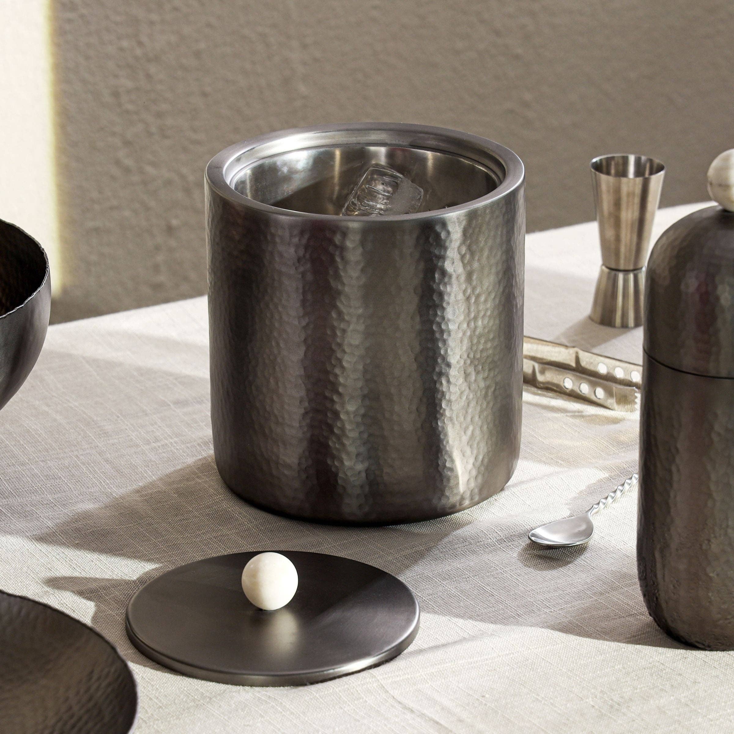 Add a bold touch of refinement to your bar with the Temari Hammered Gunmetal Ice Bucket. Handmade in India, this striking piece is crafted from stainless steel with a hammered gunmetal finish that exudes depth and modern elegance. Resting on smooth white resin ball feet, it combines artisanal texture with sleek design for a look that’s both distinctive and contemporary. Perfect for keeping ice at the ready while entertaining, this ice bucket is both functional and stylish, making every gathering feel effortlessly elevated.