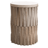 Stone from the desert of Rajasthan is hand chiseled and sculpted by artisans to create this sculptural table. The table has a removable terrazzo top and four adjustable nylon glides on the base. The table can be used indoors or outdoors.