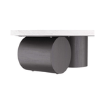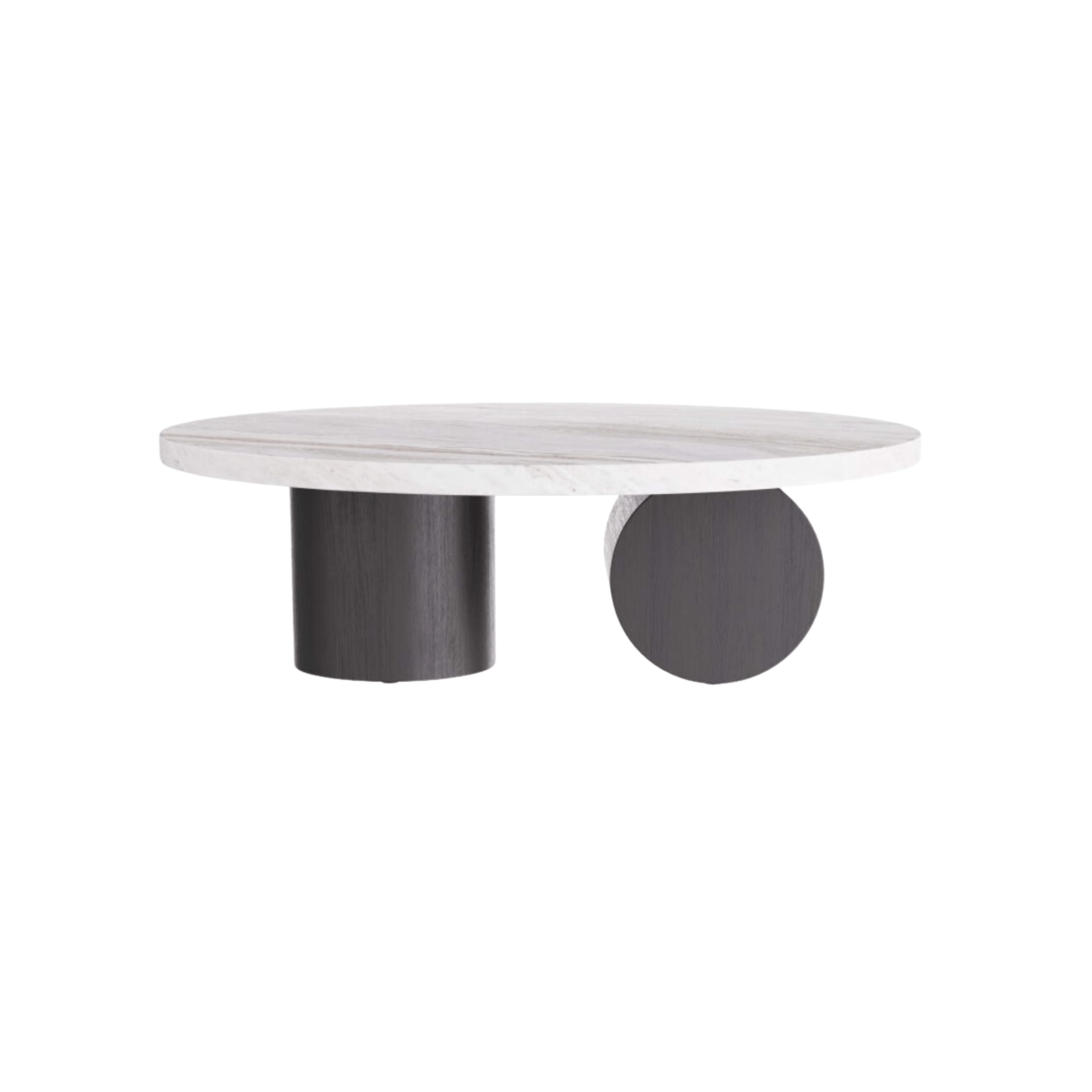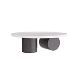 Our sculptural Torrington coffee table is executed with a minimalist sensibility with a focus on geometry and the exploration of forms. The monumental table is crafted in a toronto leathered marble oval top, with robust columnar, ebony oak shapes forming the base pedestals. Finish will vary.