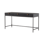 Inspired by clean midcentury design, solid poplar and raw iron fuse for style and storage alike, offering three spacious drawers, with a fully finished back plus metal-secured leather pulls for an element of surprise. Great solo or paired with matching corner desk, file cabinet or credenza.