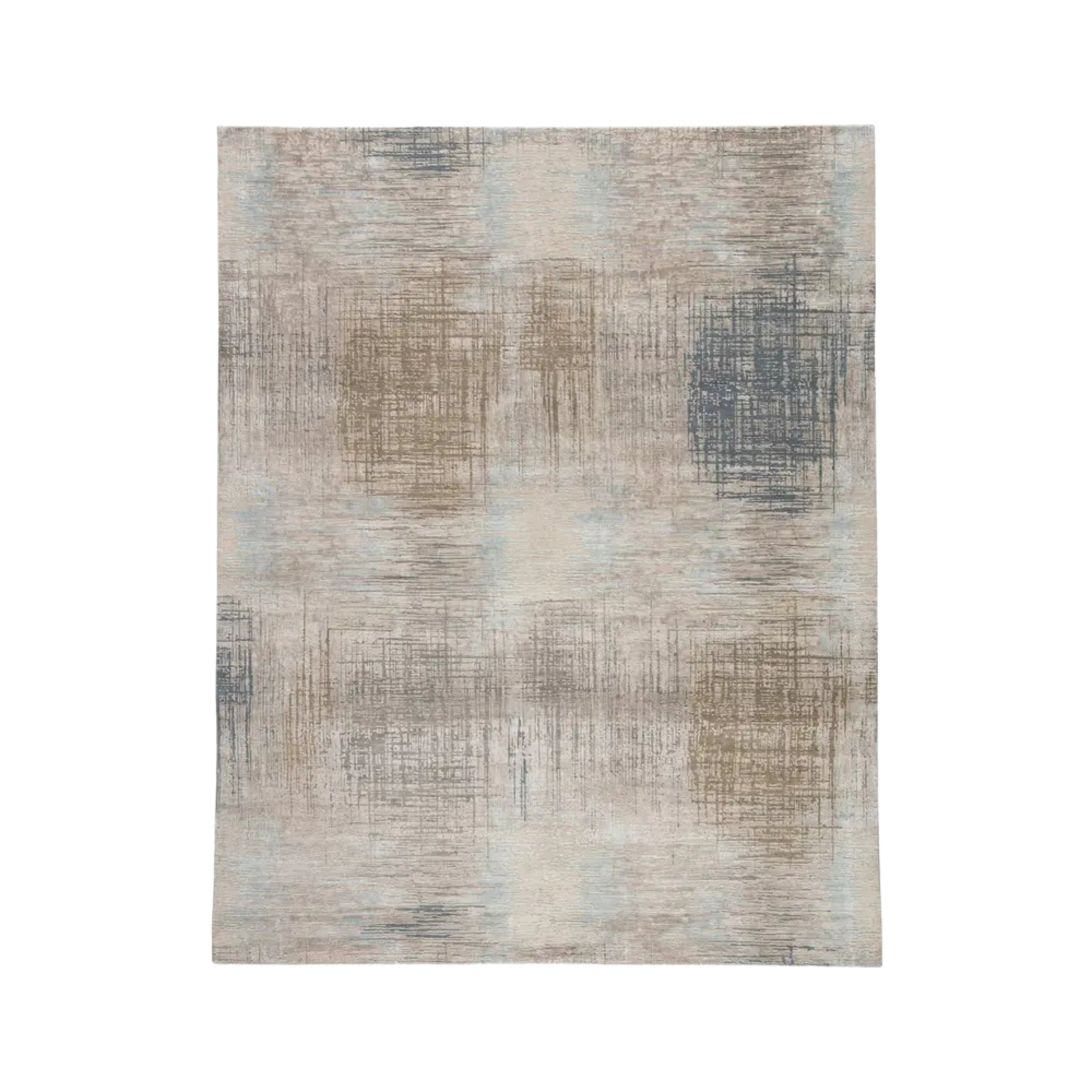 The Uvenuti collection showcases an assortment of effortless modern designs and remarkable craftsmanship. The abstract Jenya rug boasts a detailed hatch mark motif in relaxed, versatile ivory, tan, and tones of blue. A luxe combination of rayon made from bamboo and wool lends this exquisitely made hand-knotted rug a glamorous sheen and contemporary appeal.