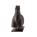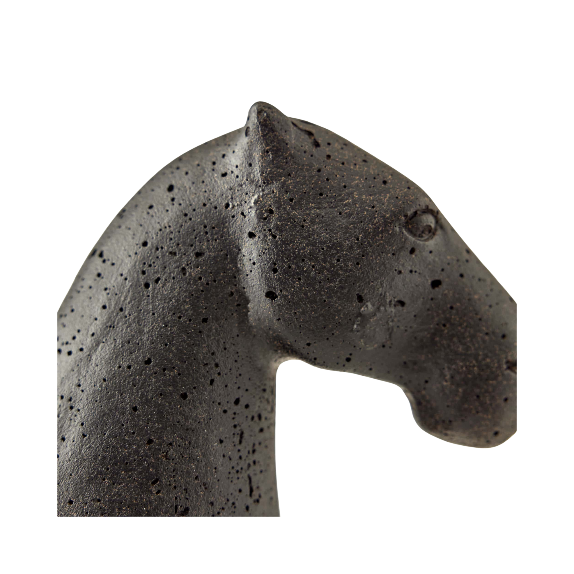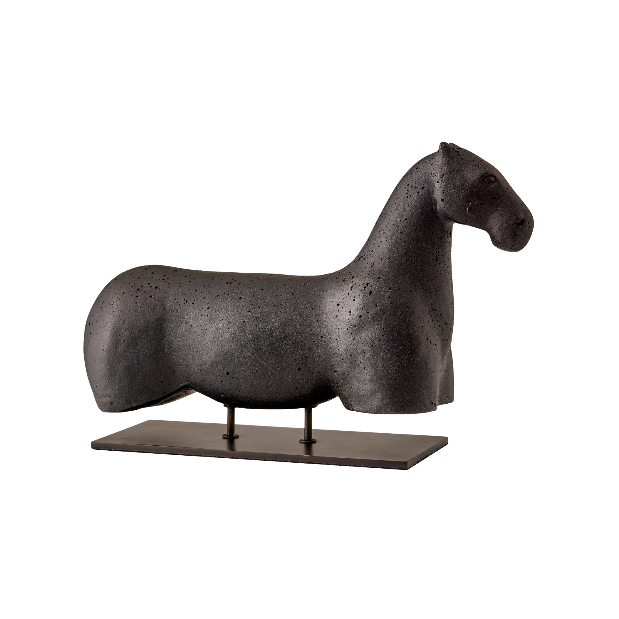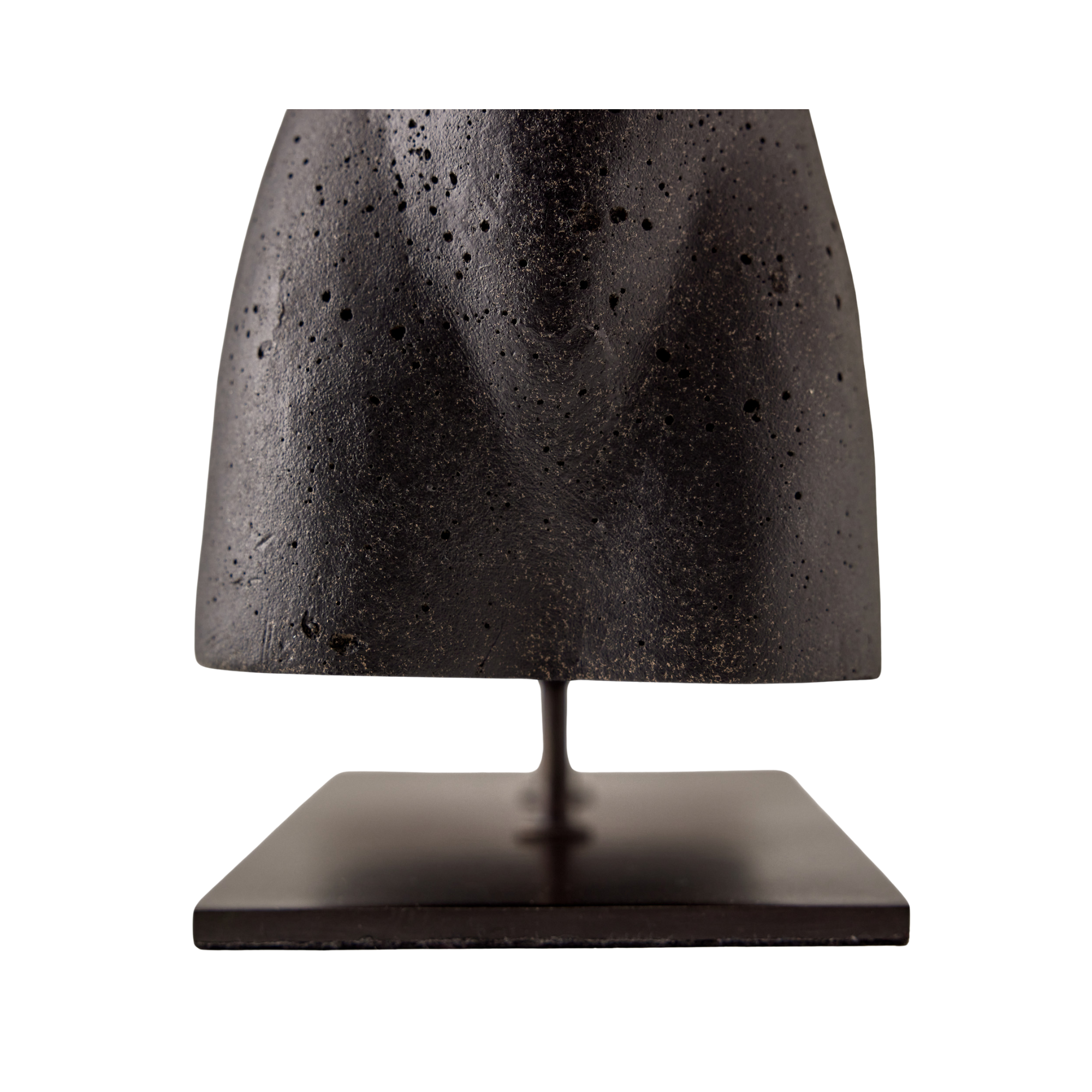 The figurative Vanderlinde tabletop sculpture was inspired by sculptures of antiquity, The art object is recast in porous charcoal riverstone composite and rests on a bronzed steel base. Finish will vary.