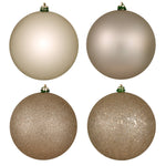 Vickerman 4.75" Oat 4-Finish Ball Ornament Set. This set includes matte, shiny, glitter, and sequin finished ornaments for a touch of variety to any holiday decorating project. This assortment is an exceptional addition to any collection as it matches well with a variety of décor and goes perfectly on a holiday tree. Includes 4 ornaments per box.