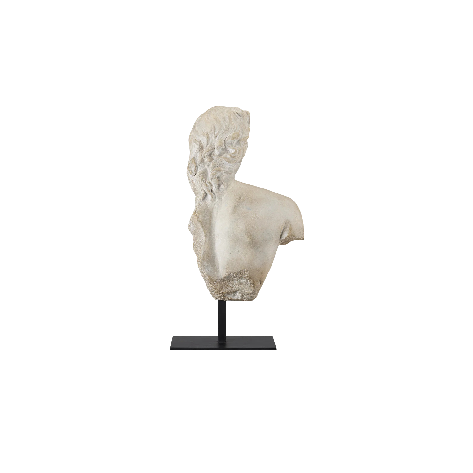 Though the Young Royal Greek Torso looks as if it has survived since ancient times, it is actually made of composite and inspired by a museum piece that was a valuable antique. The skill of the artisans who created it is evident, not only in how the broken areas are so convincing but in the aged-beige finish that fools the eye into thinking it is carved from stone. The beige sculpture is fastened to a black metal base, whish is also museum-style.